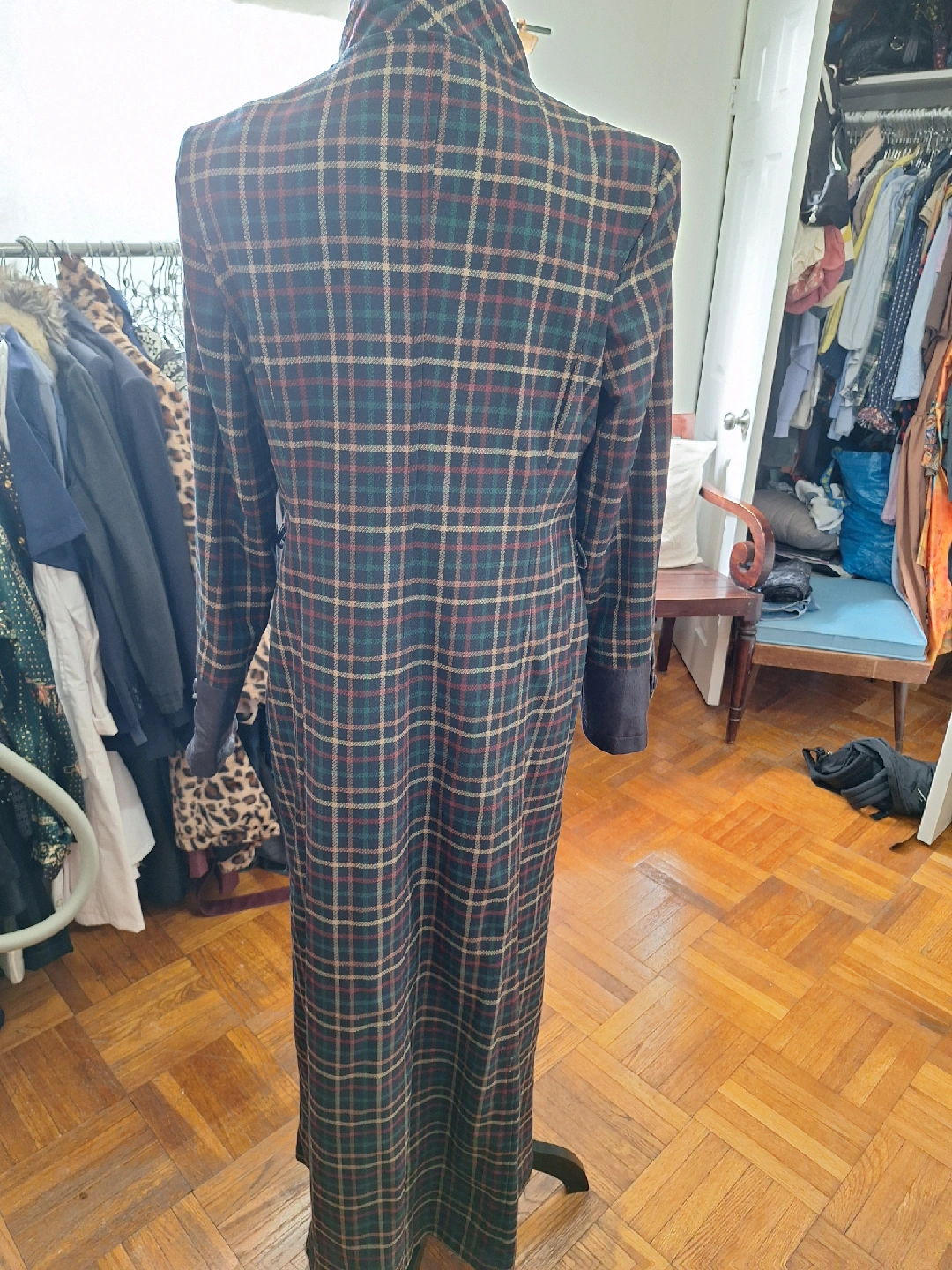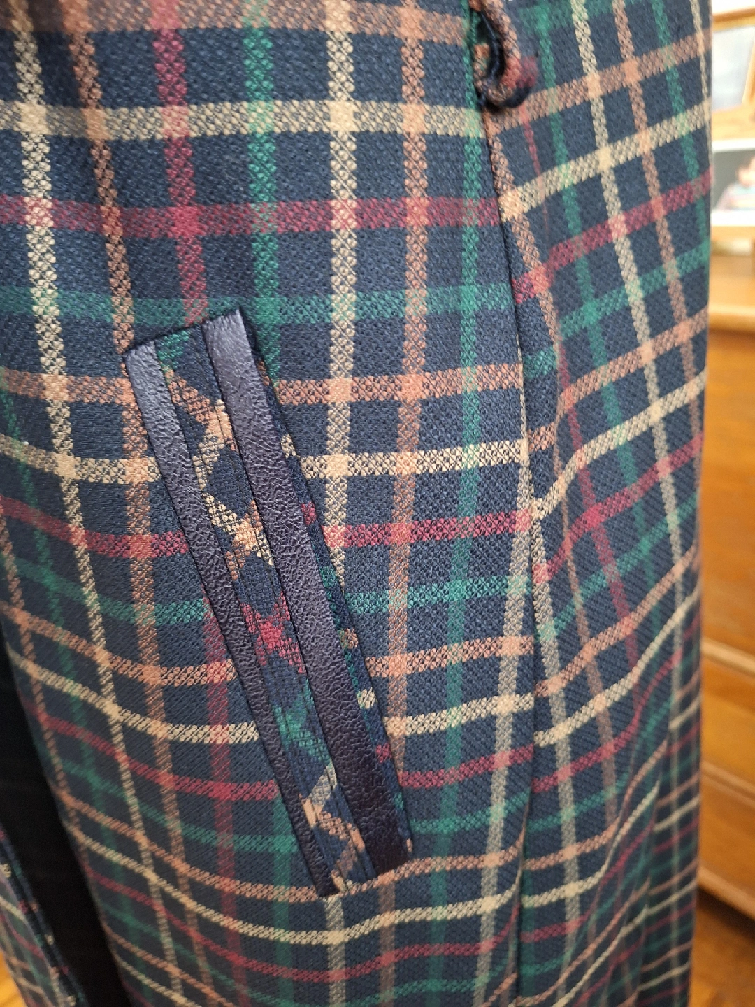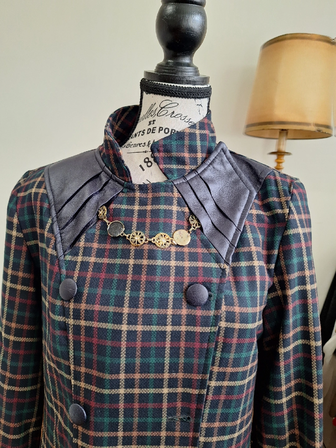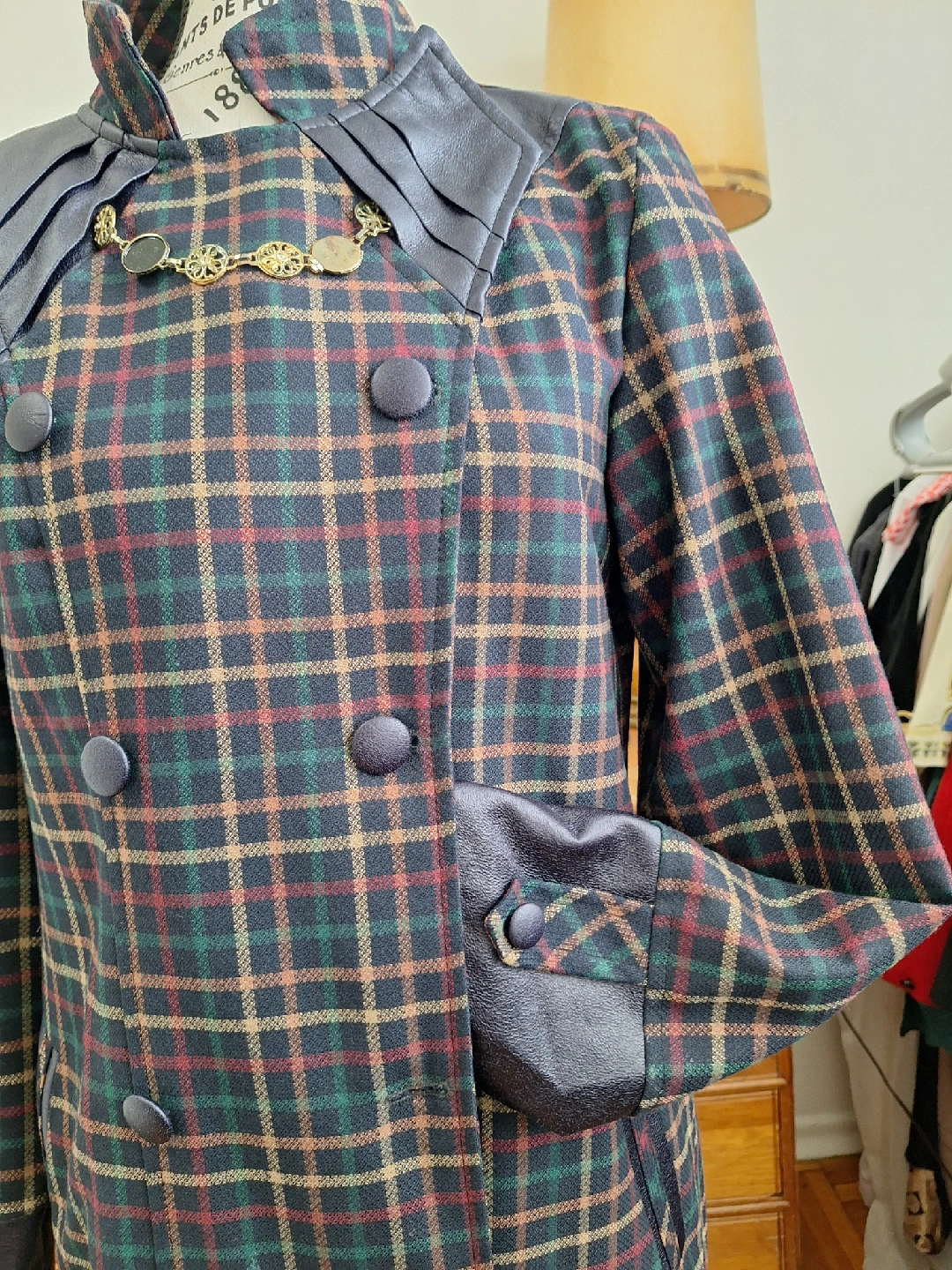 Here's a vintage coat with a unique plaid pattern! It features a wool blend material and distinctive leather-like accents on the collar, pockets, and cuffs. The coat has a double-breasted button closure and a long, elegant silhouette. Perfect for adding a touch of vintage charm to your wardrobe!