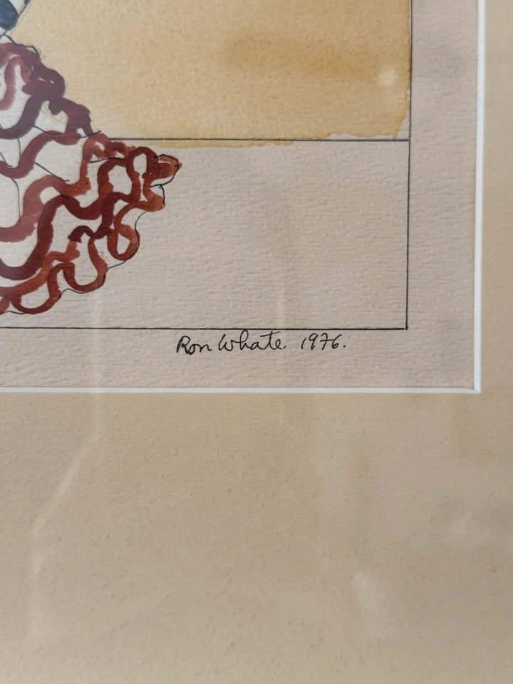 Original watercolour painting titled “Miranda”, signed and dated 1976 by Canadian artist Ron Whate. This striking piece features a stylized theatrical/fashion figure with bold costume detail and warm, mid-century colour tones—very evocative of 1970s fashion illustration.