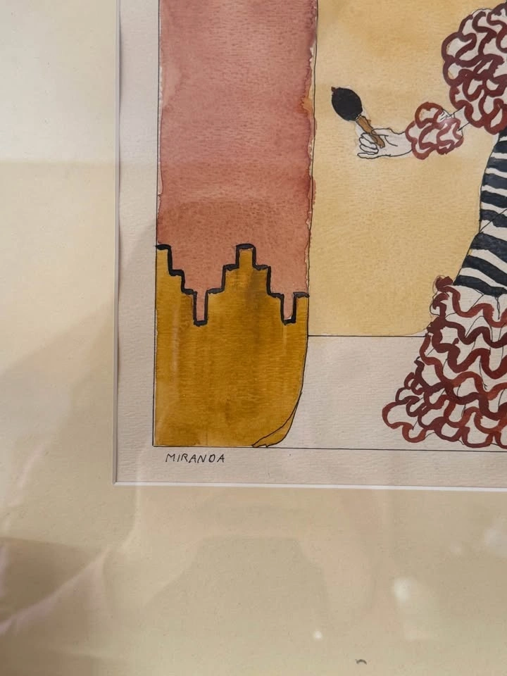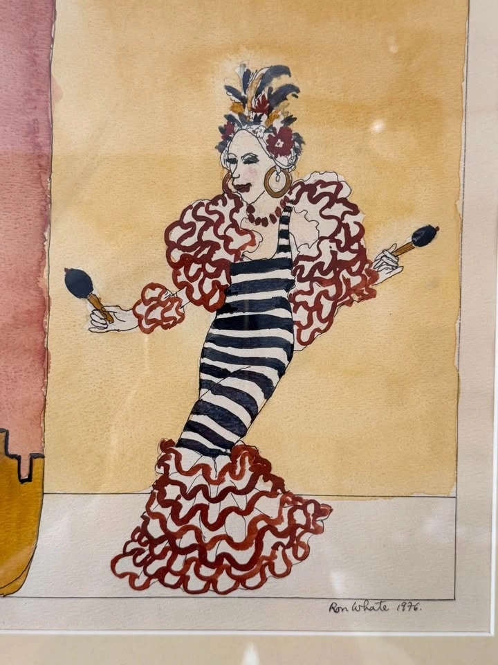 Original watercolour painting titled “Miranda”, signed and dated 1976 by Canadian artist Ron Whate. This striking piece features a stylized theatrical/fashion figure with bold costume detail and warm, mid-century colour tones—very evocative of 1970s fashion illustration.