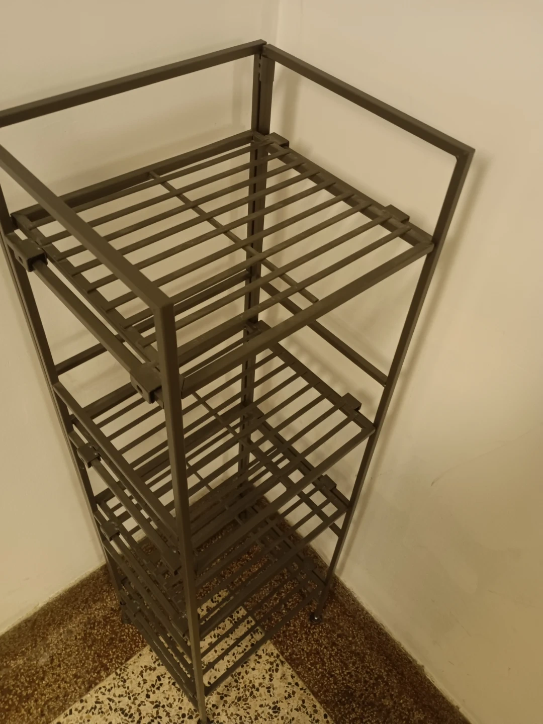 This is a dark grey metal shelf unit with four tiers. It's a sturdy, tall unit for storage or display. Its slatted shelves offer good air circulation.