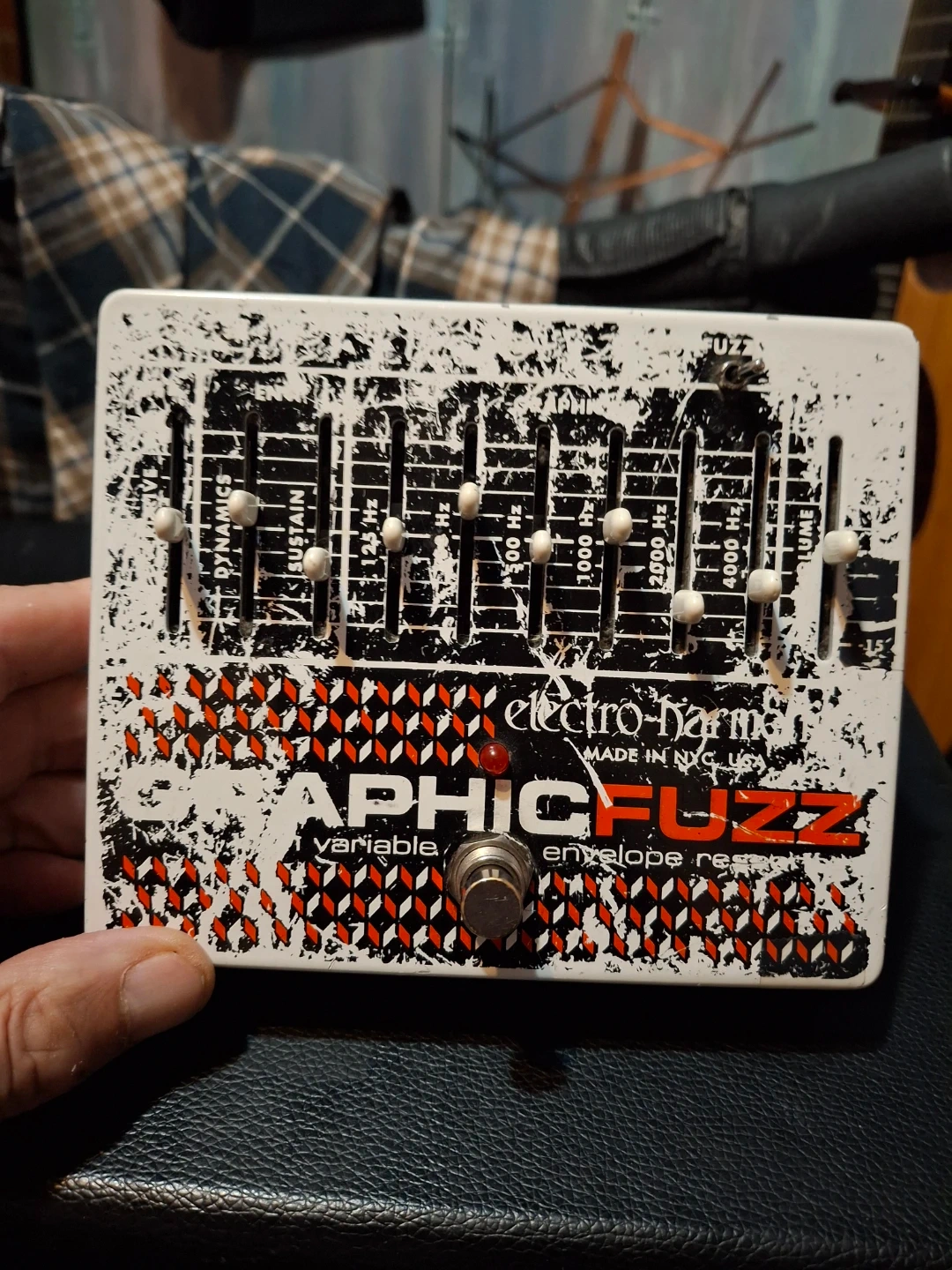 This is an Electro-Harmonix APHICFUZZ guitar pedal. It features adjustable controls