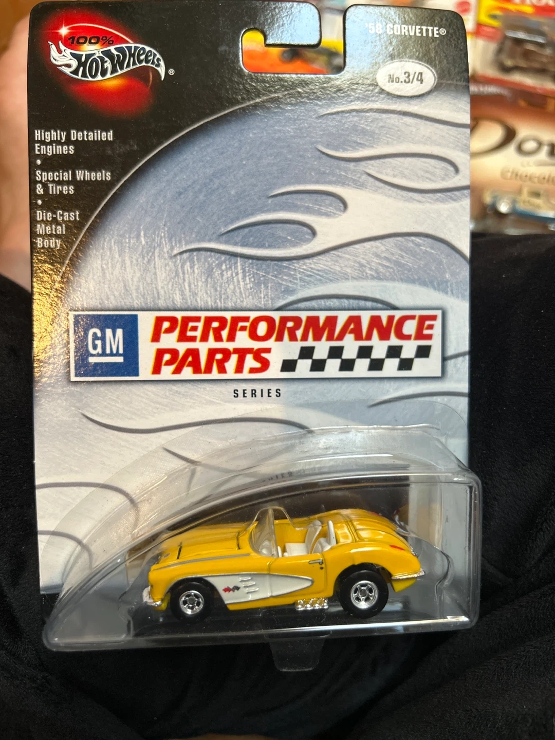 Collectible Hot Wheels '58 Corvette. Die-cast car, yellow with white accents. Part of GM Performance Parts Series, No. 3/4. Still in original packaging, never opened. Has highly detailed engine, special wheels and tires. Metal body.