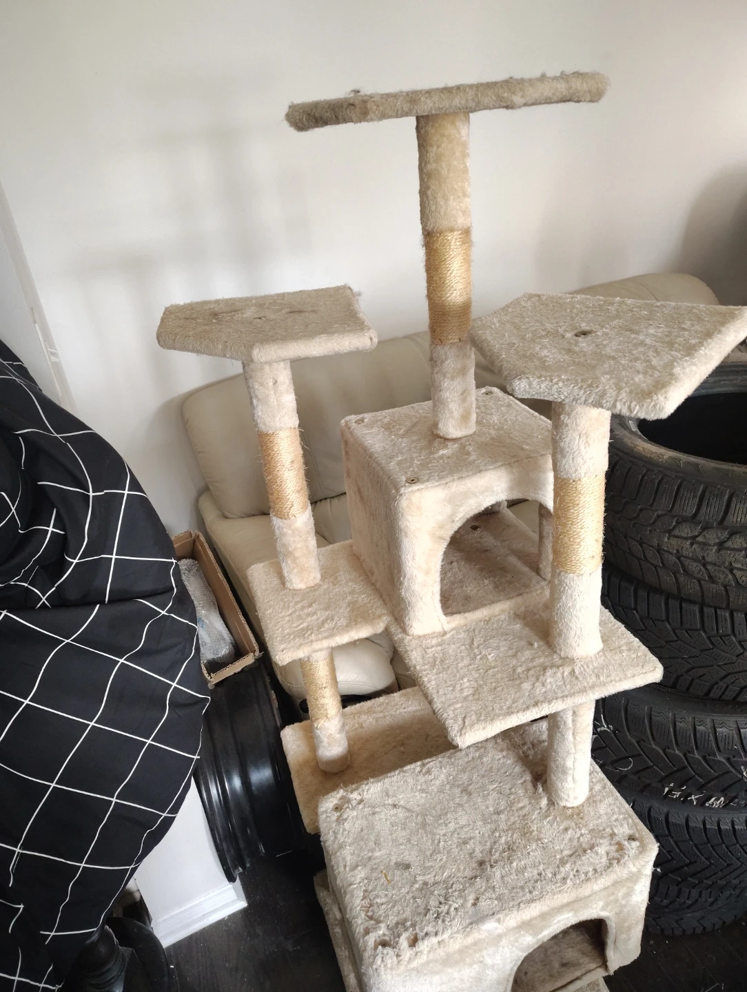 This multi-level cat tree condo offers a cozy space for your feline friends to climb, play, and lounge. It's covered in soft, neutral-coloured carpeting with scratching posts wrapped in sisal rope. It includes multiple platforms, hideaways, and perches for your cat's enjoyment.