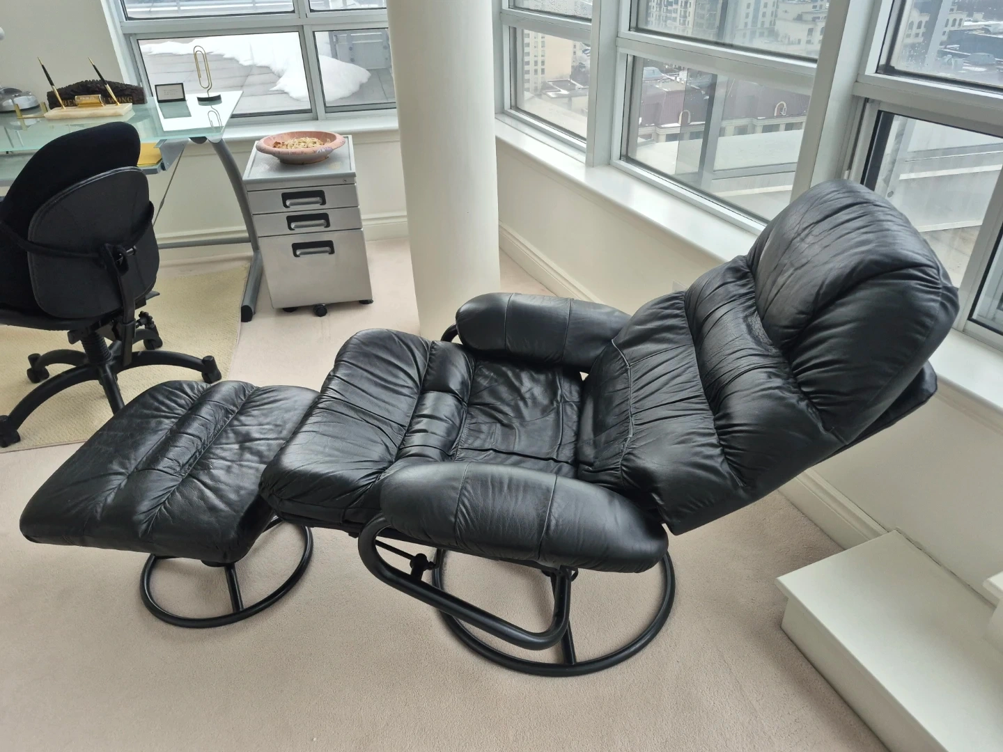 Comfortable black leather recliner chair with a matching ottoman. It features a padded design for extra coziness and a swiveling base. This chair is great for relaxing.