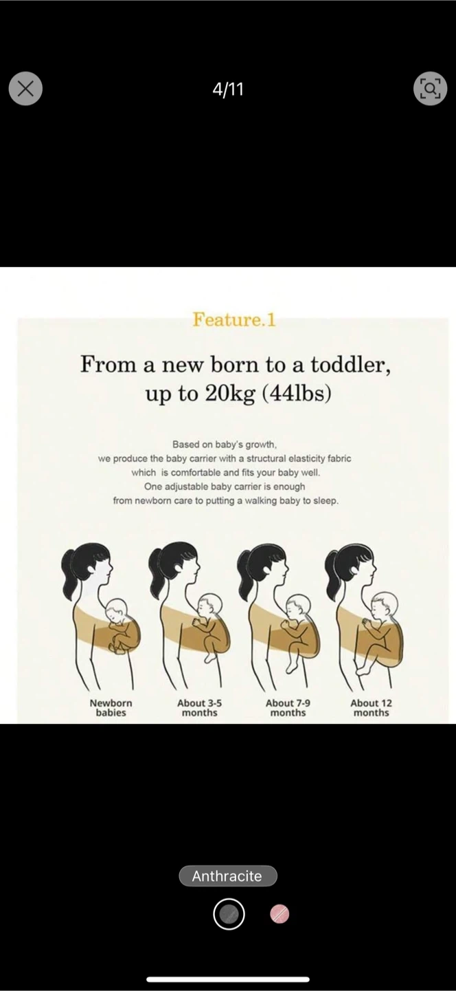 This baby carrier is designed for newborns up to toddlers, supporting up to 20kg (44lbs). It's made with a structural elasticity fabric for comfort and a secure fit. It can be worn like a t-shirt with no prep, loop fasteners, or buckles. This carrier is useful from birth until the baby is walking.