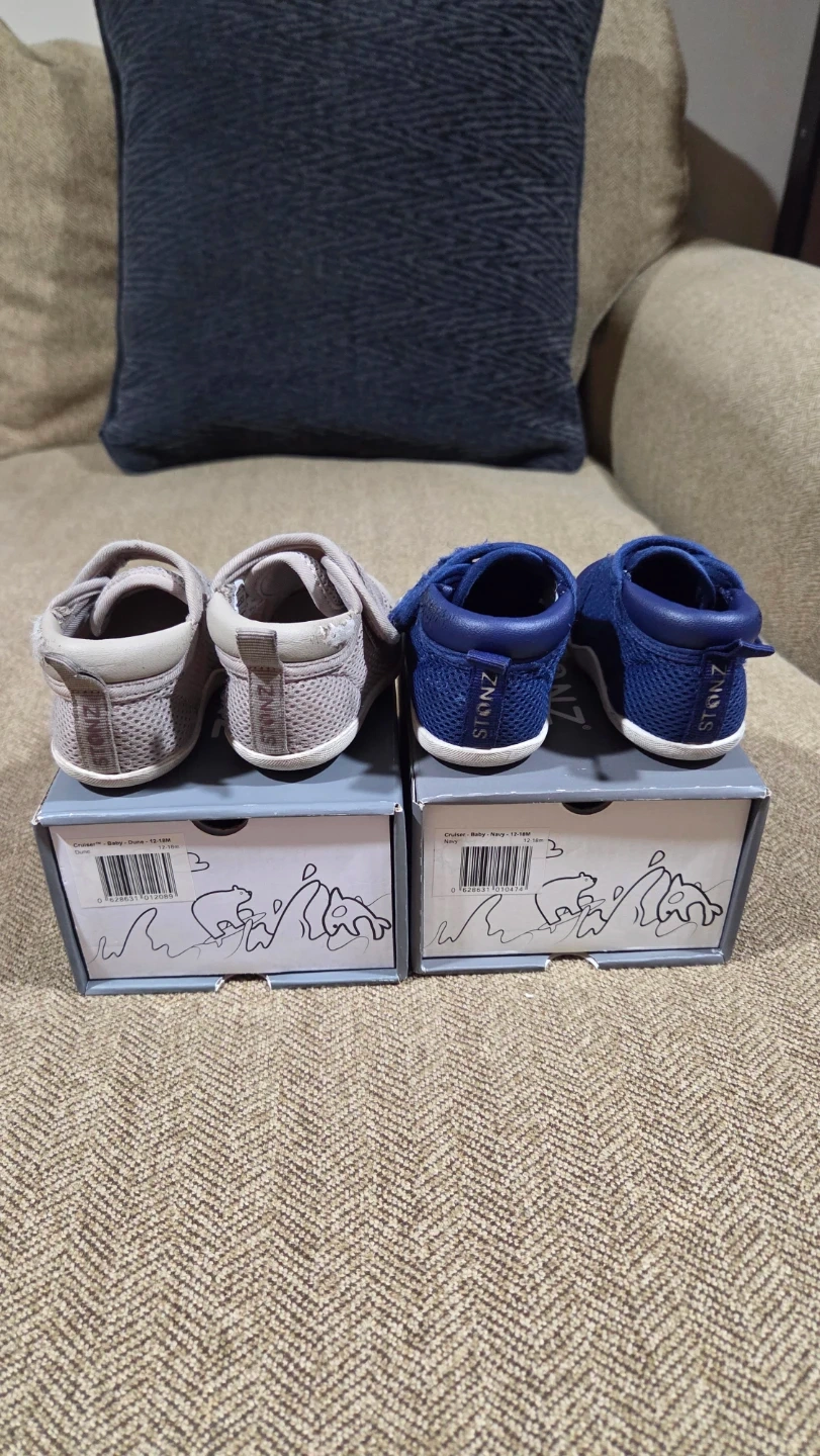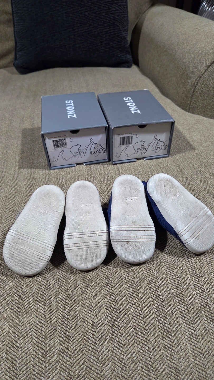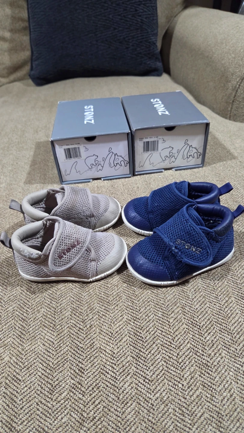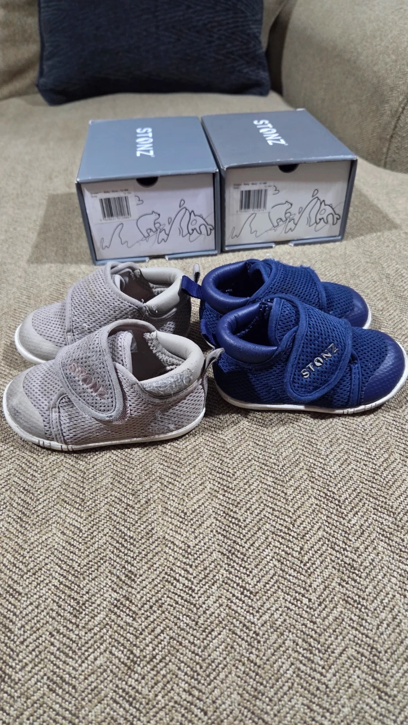 I'm selling two pairs of Stonz shoes for babies or toddlers, size 12-18 months. Pictures show some wear and tear. Used at daycare.
