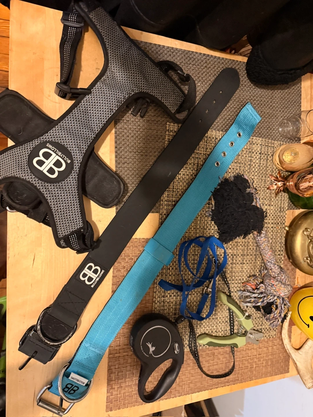 This set includes a BullyBillows dog harness and collars, collapsing dog bowl,rope toy plus a retractable leash and nail clippers. New and slightly used. Great for walks and pet grooming! Everything is meant for a larger dog around 95lbs