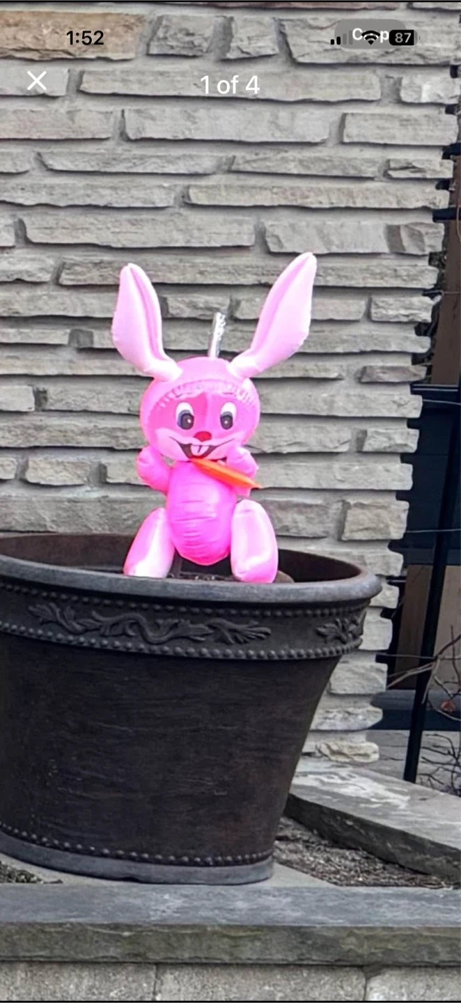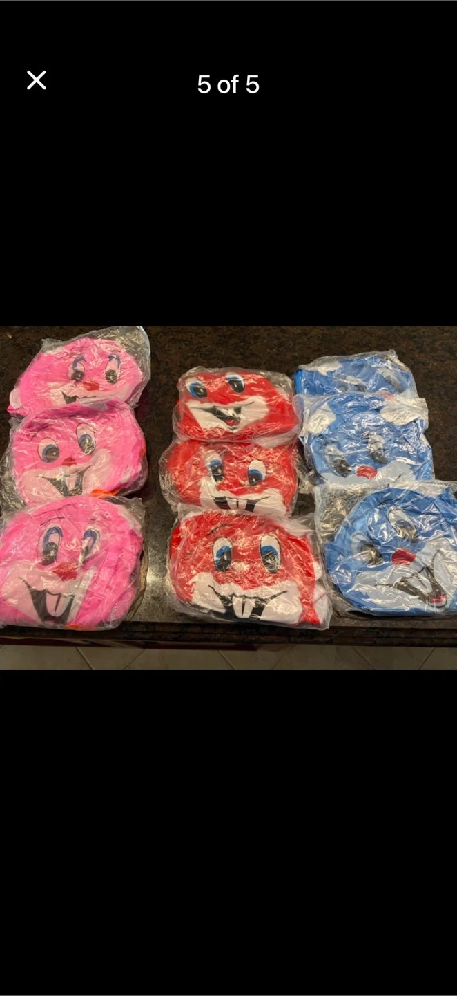 9 blow up bunnies, new in packaging. See 5 pics. Three red, three pink, three blue. Selling on Amazon 9/$21. I’m selling 9 for $5. There are 3 of each colour. Welcome sign, not included.