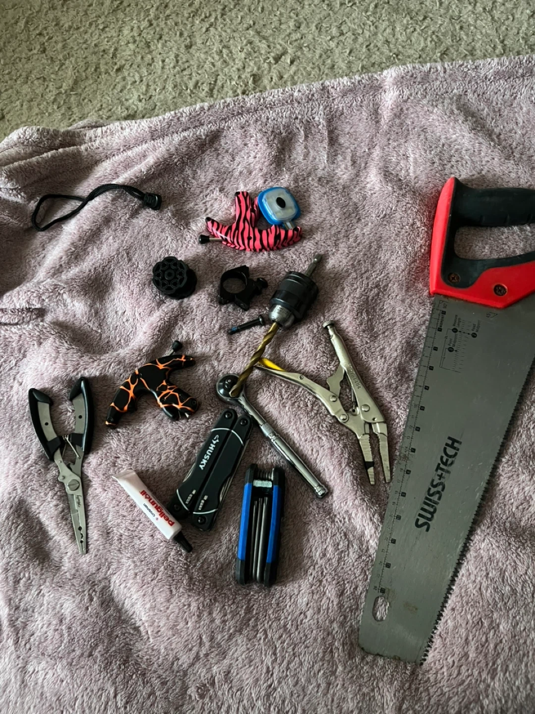Assorted Tools Including Saw, Pliers, and Multi-tool