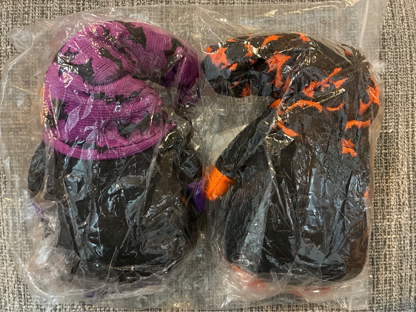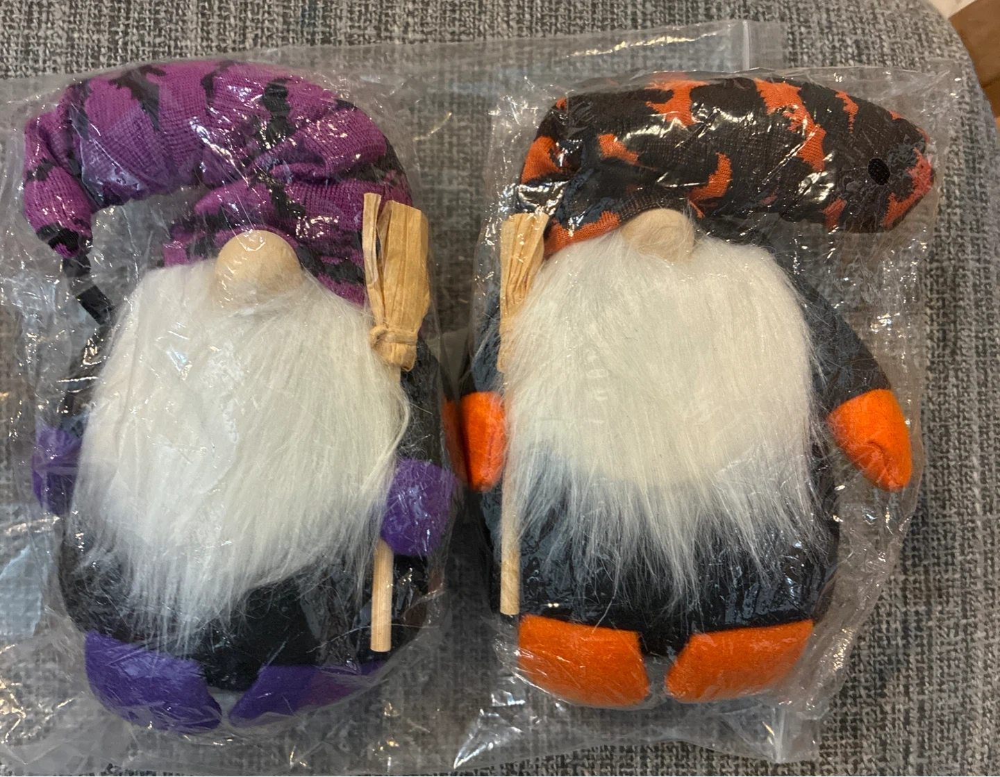 Two adorable Halloween-themed gnomes are included. One gnome has a purple and black striped hat with a white beard and broom. The other gnome has an orange and black patterned hat with a white beard and broom. They're perfect for spooky season decor!
