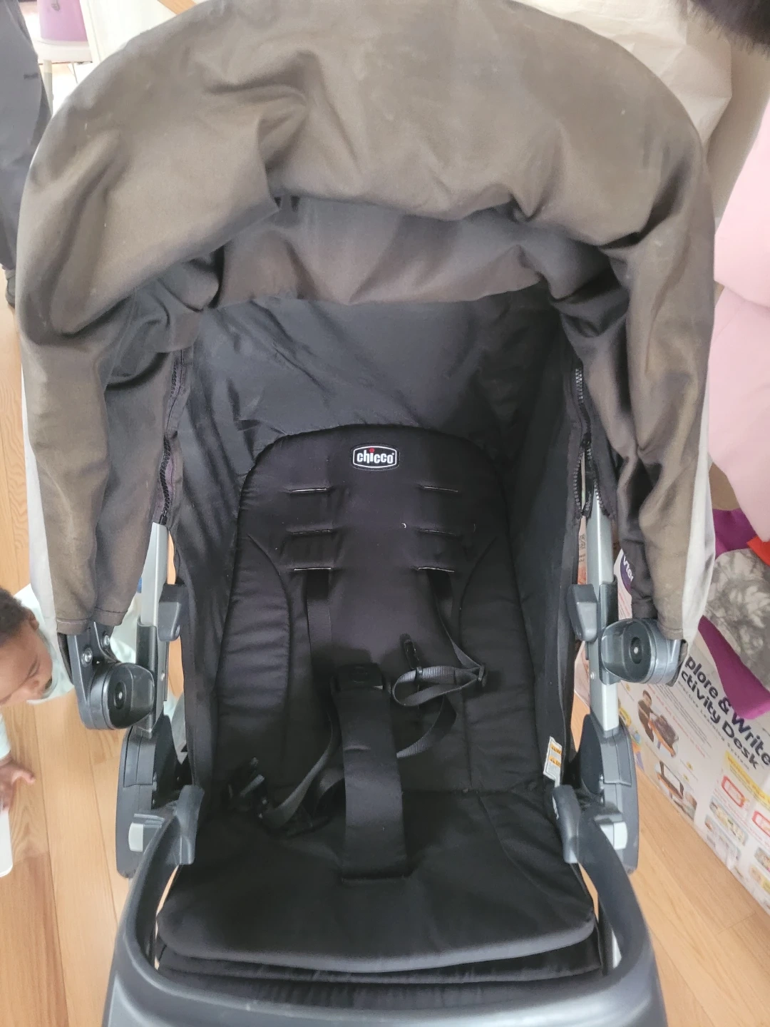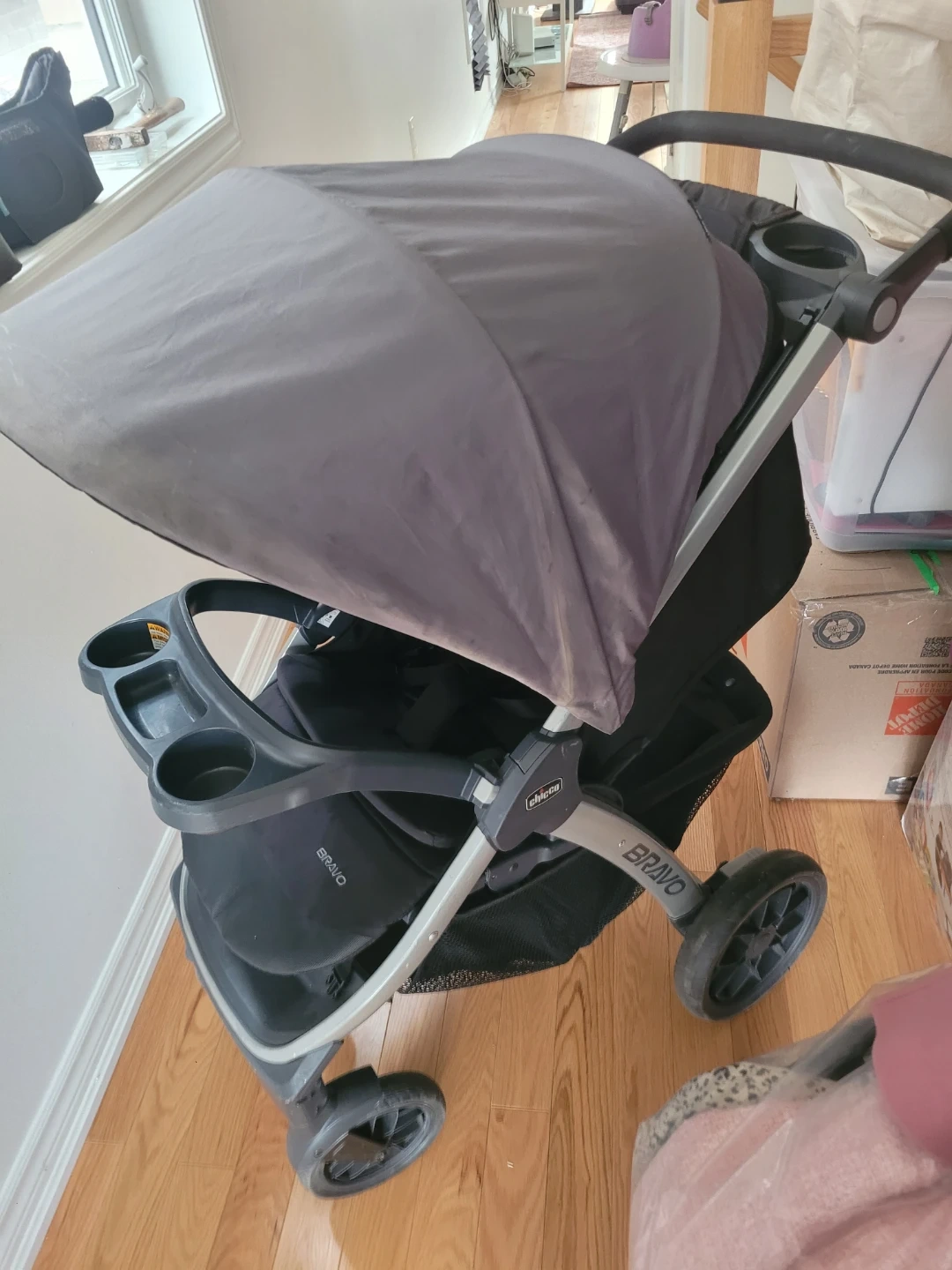This is a Chicco Bravo stroller with car seat in black. It includes a removable child tray with cup holders. The stroller has a 5-point harness for safety. It's suitable for transporting a your baby and toddler.