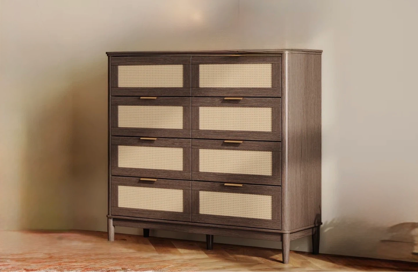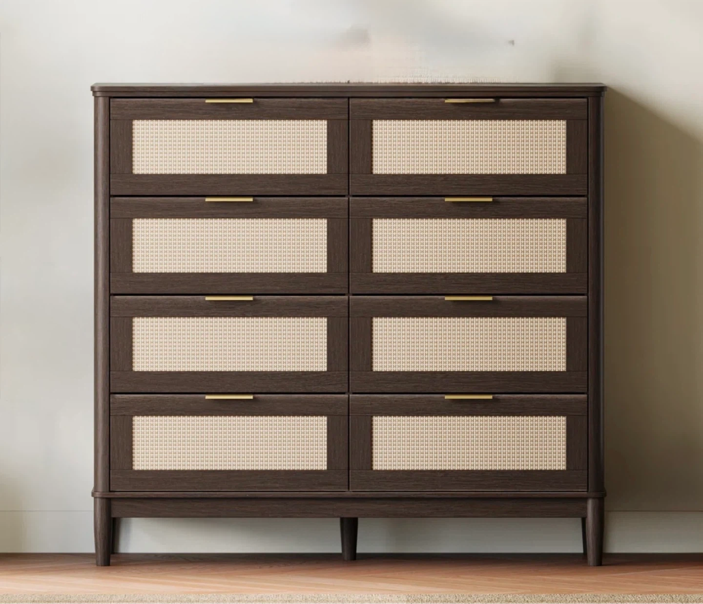 New and unused Truffle Home dresser features a dark wood finish with eight cane-front drawers.