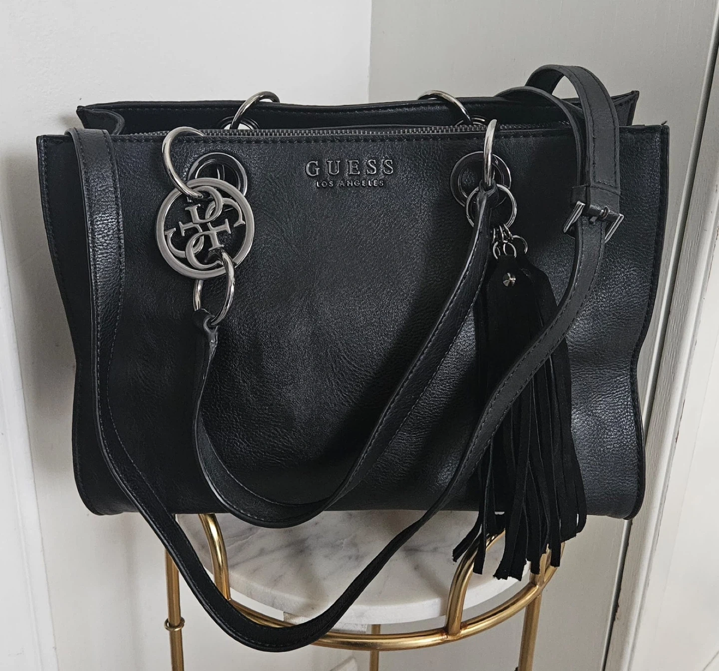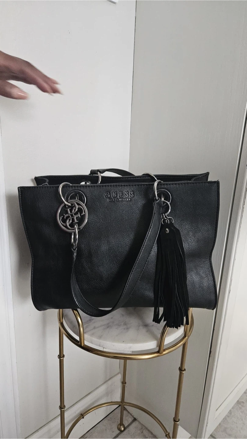 This is a black Guess Los Angeles tote bag. It features silver-tone hardware and a decorative tassel charm. The bag has dual top handles and a detachable shoulder strap. It's a stylish accessory for everyday use!