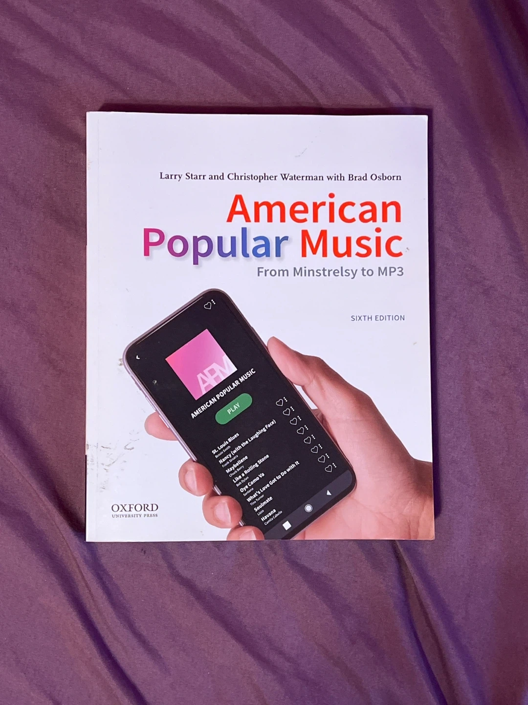 This is the sixth edition of American Popular Music, authored by Larry Starr, Christopher Waterman, and Brad Osborn. It covers popular music from Minstrelsy to MP3. It's a textbook from Oxford University Press.