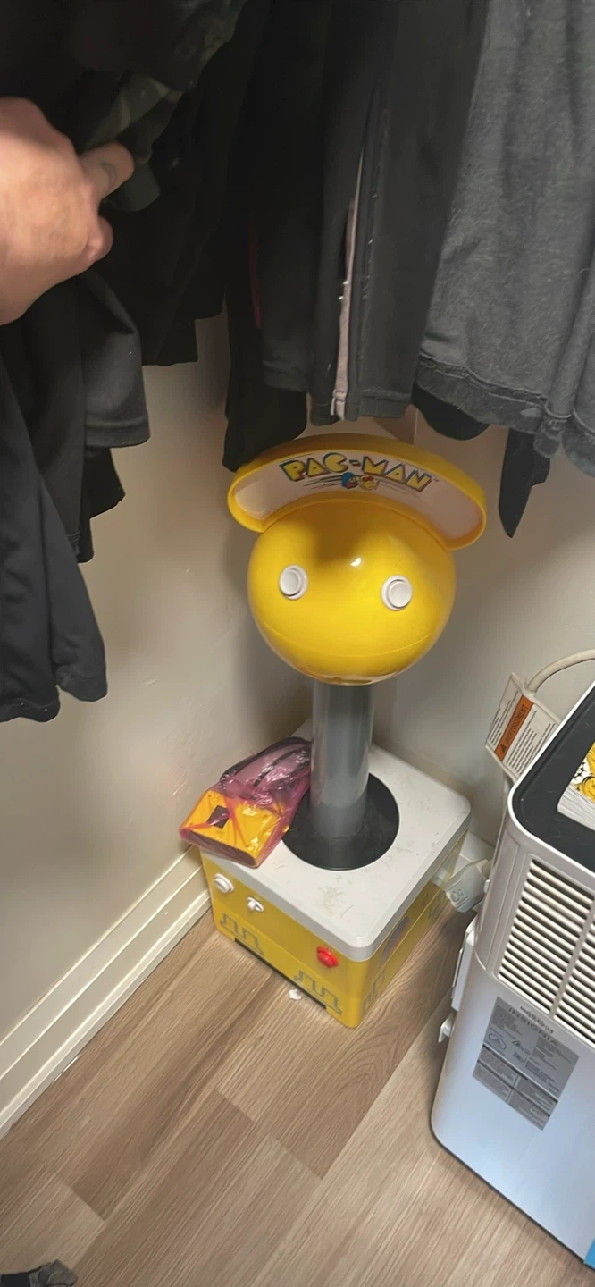 This is a yellow Pac-Man arcade game stand. It has the Pac-Man logo on the top. It's a fun collectible for any fan! Never used out of box have fun with the kids or adults great game for family fun night