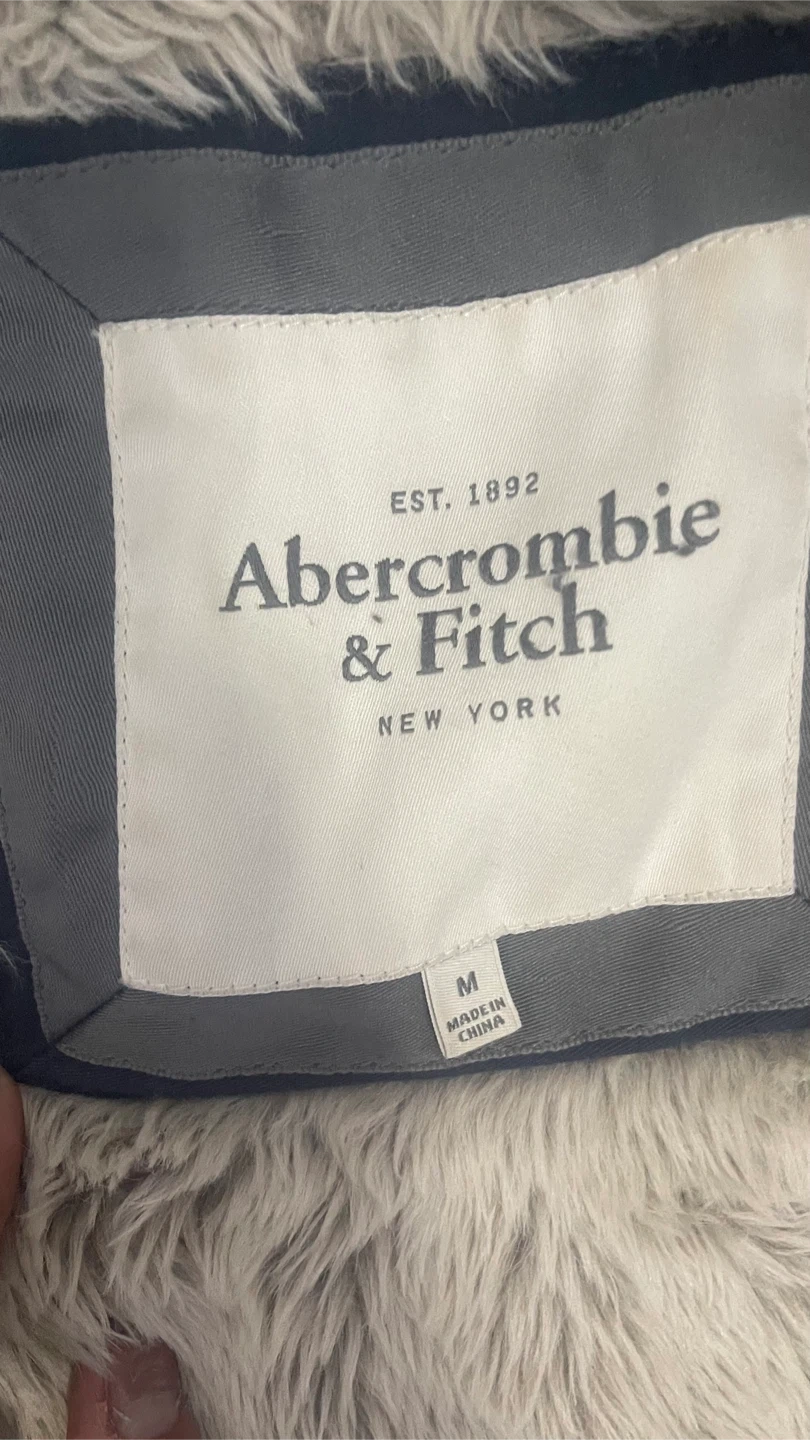 Abercrombie & Fitch bomber jacket in navy. It's a size medium and made in China. This jacket has a faux fur lining and ribbed cuffs and hem.
