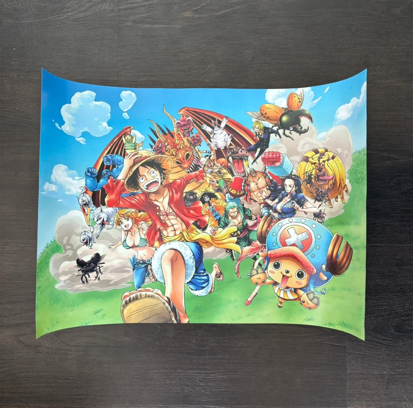 Poster featuring characters from the anime One Piece. It's a vibrant print with a group of characters in a grassy, cloudy setting. Perfect for any fan of the series!
