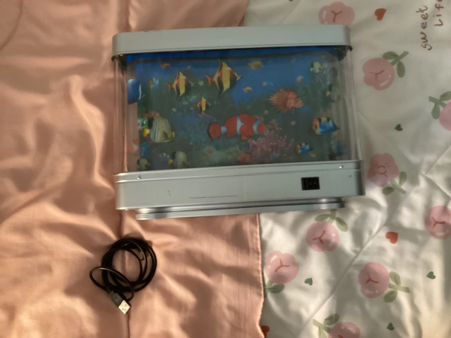 This is a cute fish tank aquarium lamp! It comes with a USB cable so you can plug it in to power it up. It's in great condition and would look lovely in any room!