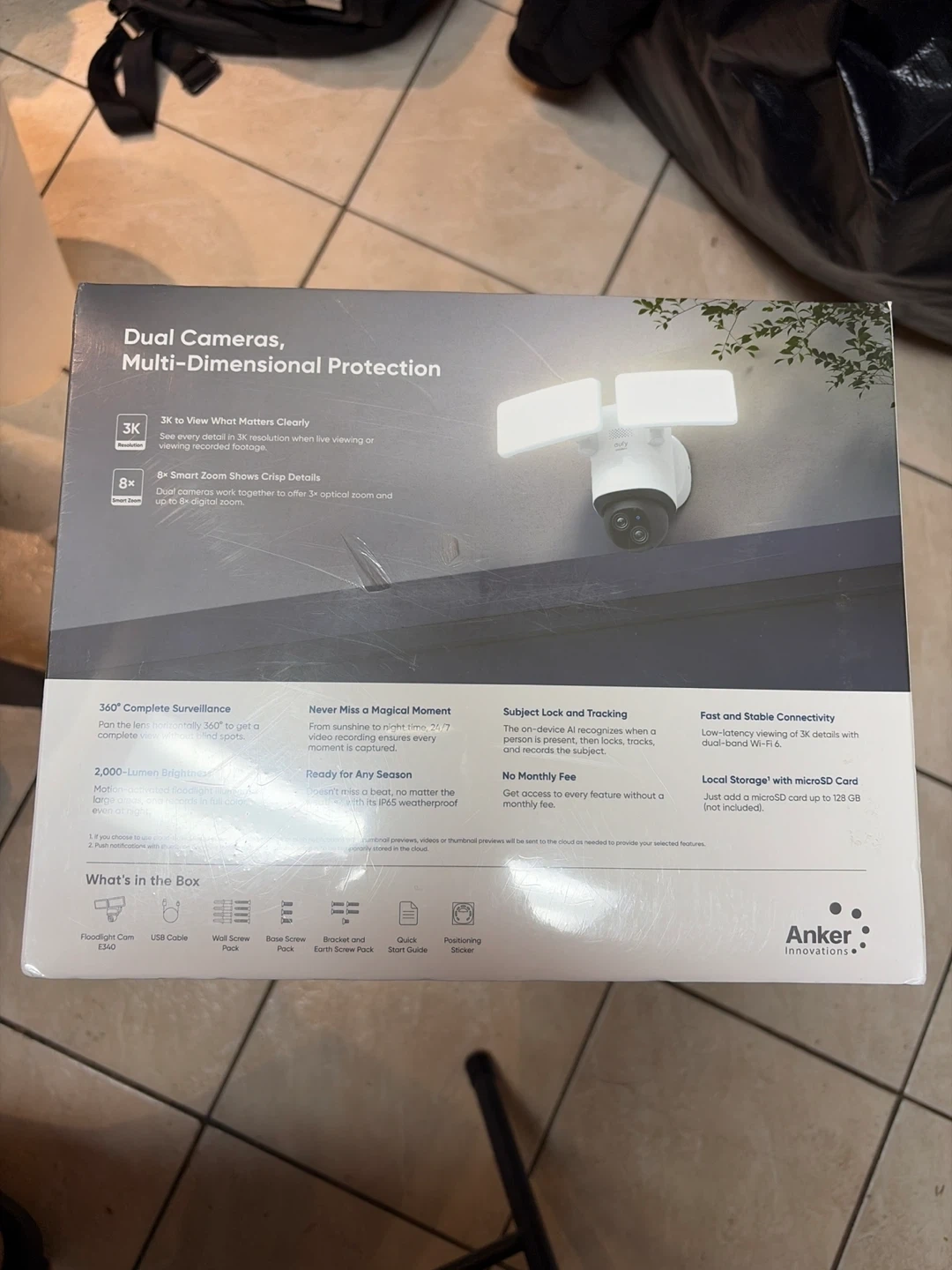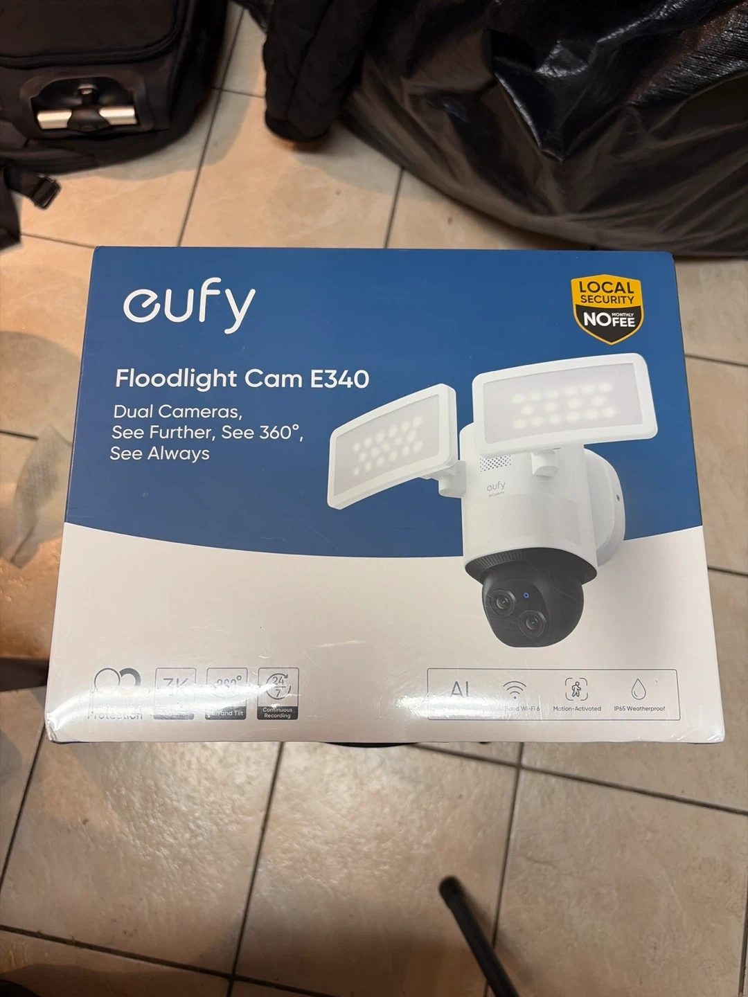 Selling a eufy Floodlight Cam E340. It features dual cameras and records in 3K resolution.