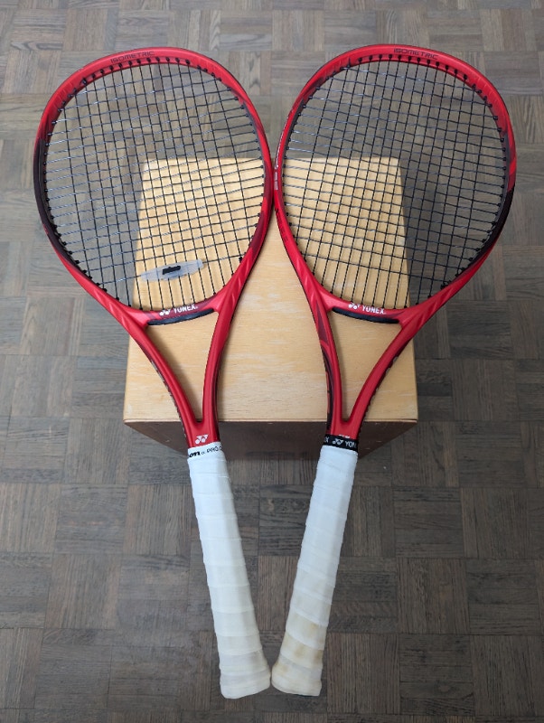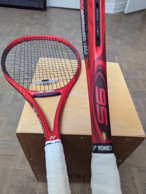 Looking to sell my pair of 2018 Yonex Vcore 95s. Grip size: #1 Replacement grip: Gamma Leather String: Tier 1 Black Knight Reason for selling: Switched to Pure Aero 98 $200 for 1 $350 for 2