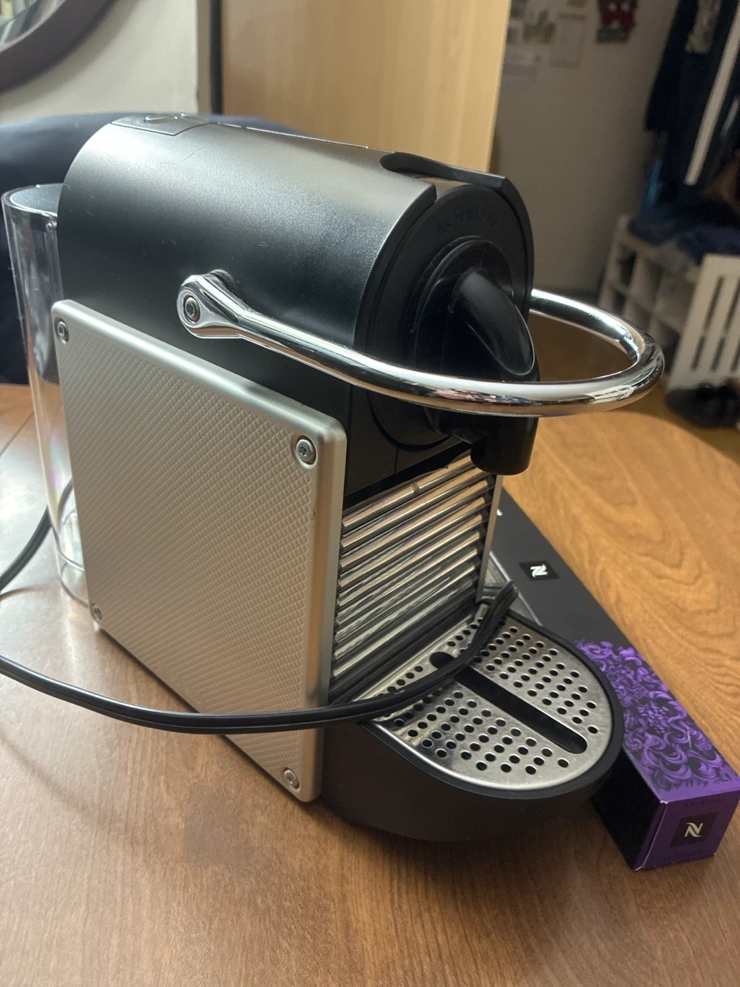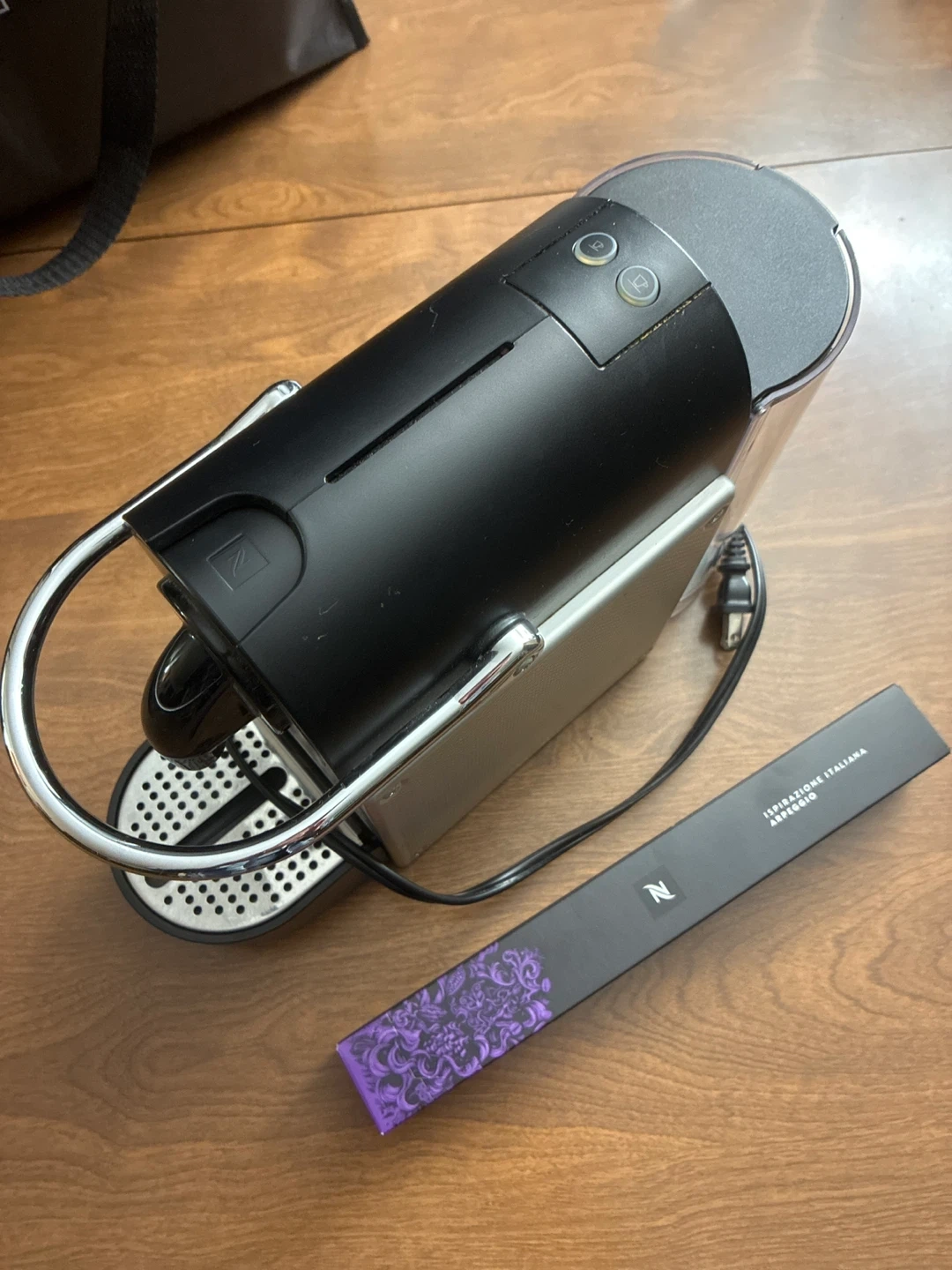 This is a Nespresso Essenza Mini espresso machine. It's black and silver and comes with an included box of "Ispirazione Italiana Arpeggio" Nespresso capsules. Perfect for making espresso at home!