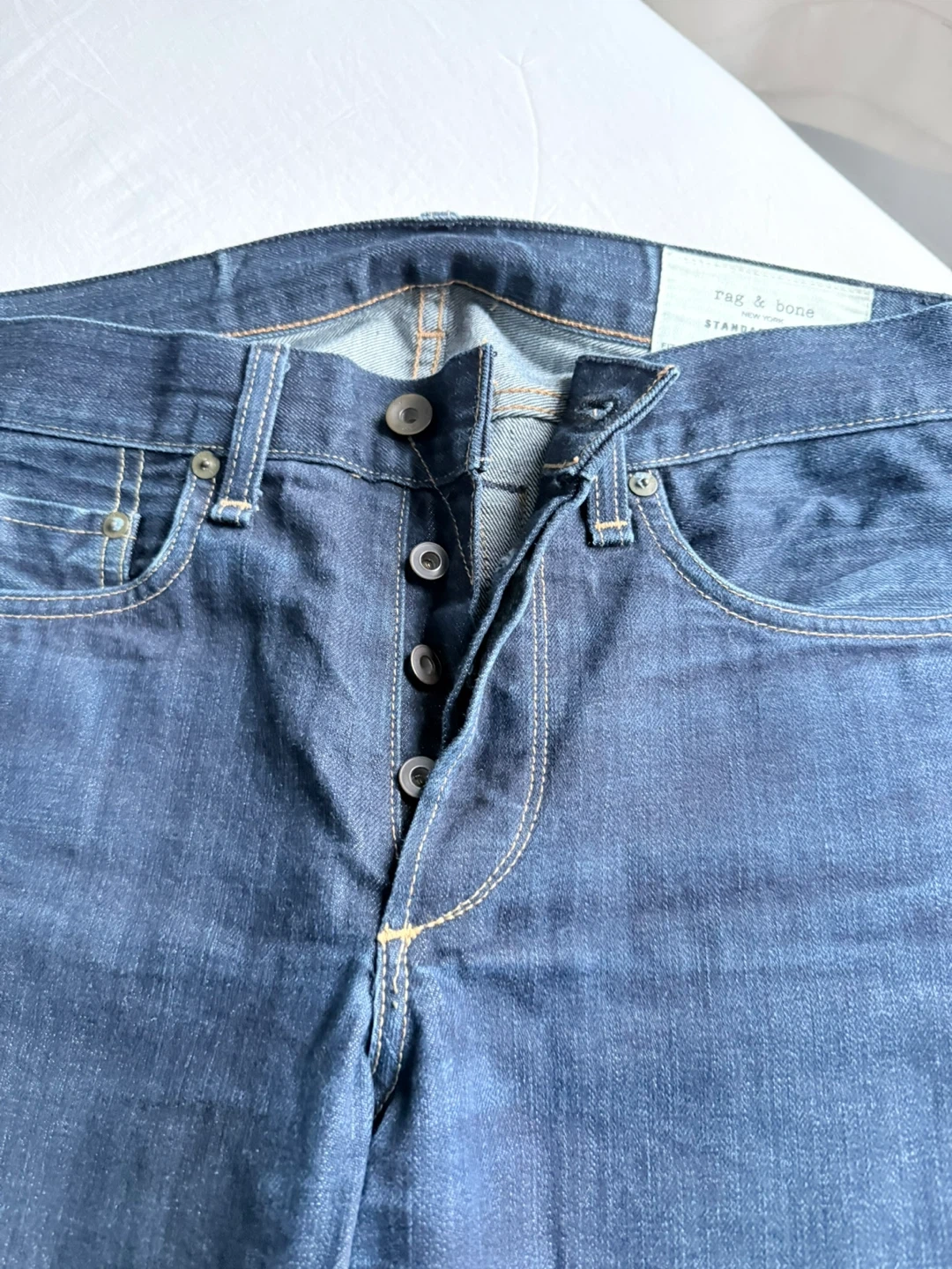 Rag & Bone Standard Issue denim jeans in a slim leg fit. The jeans are size 30. They feature a button fly closure and dark wash denim.