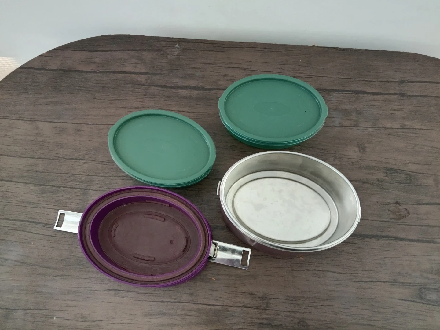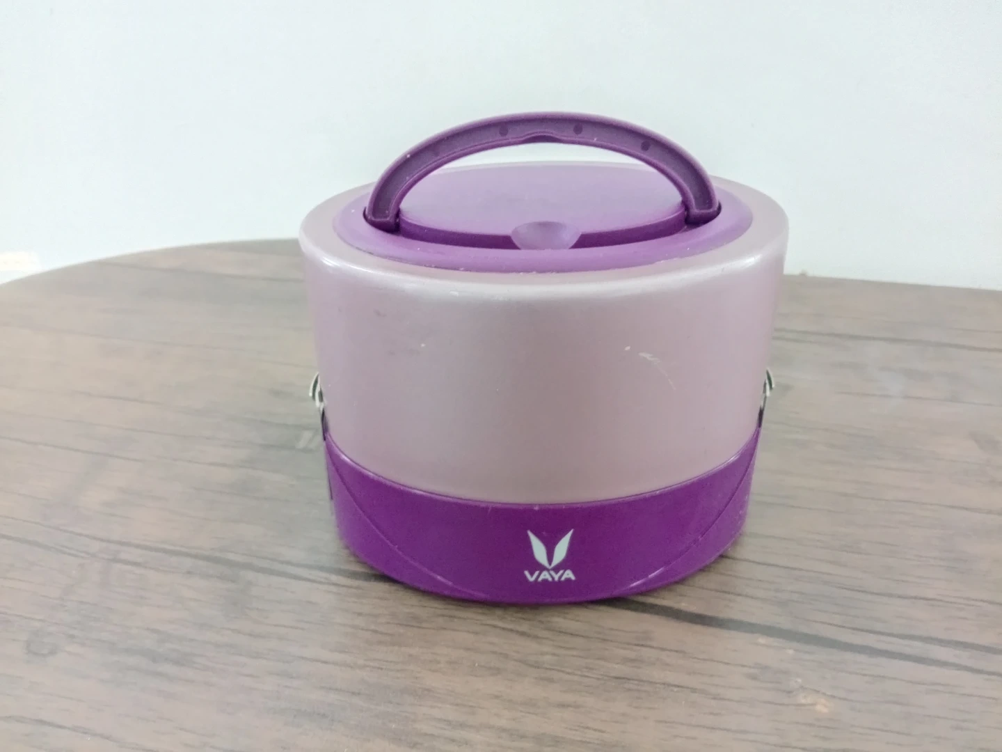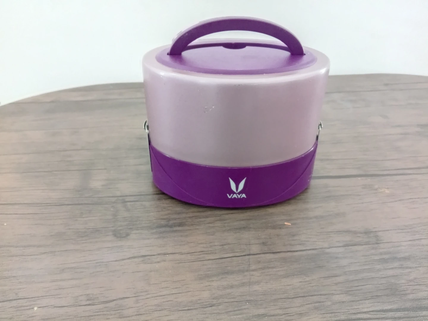 Vaya insulated lunch box in purple and silver. It's a stackable design with a secure locking mechanism. Includes two containers with green lids.