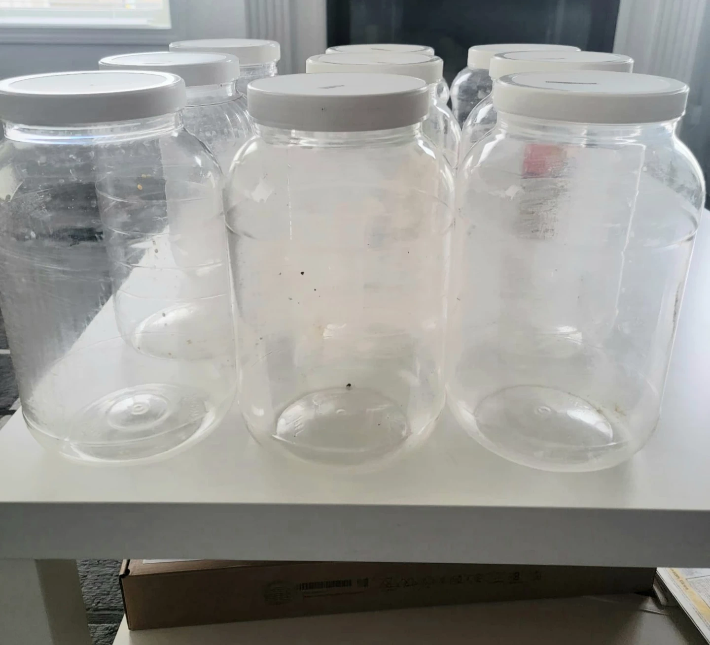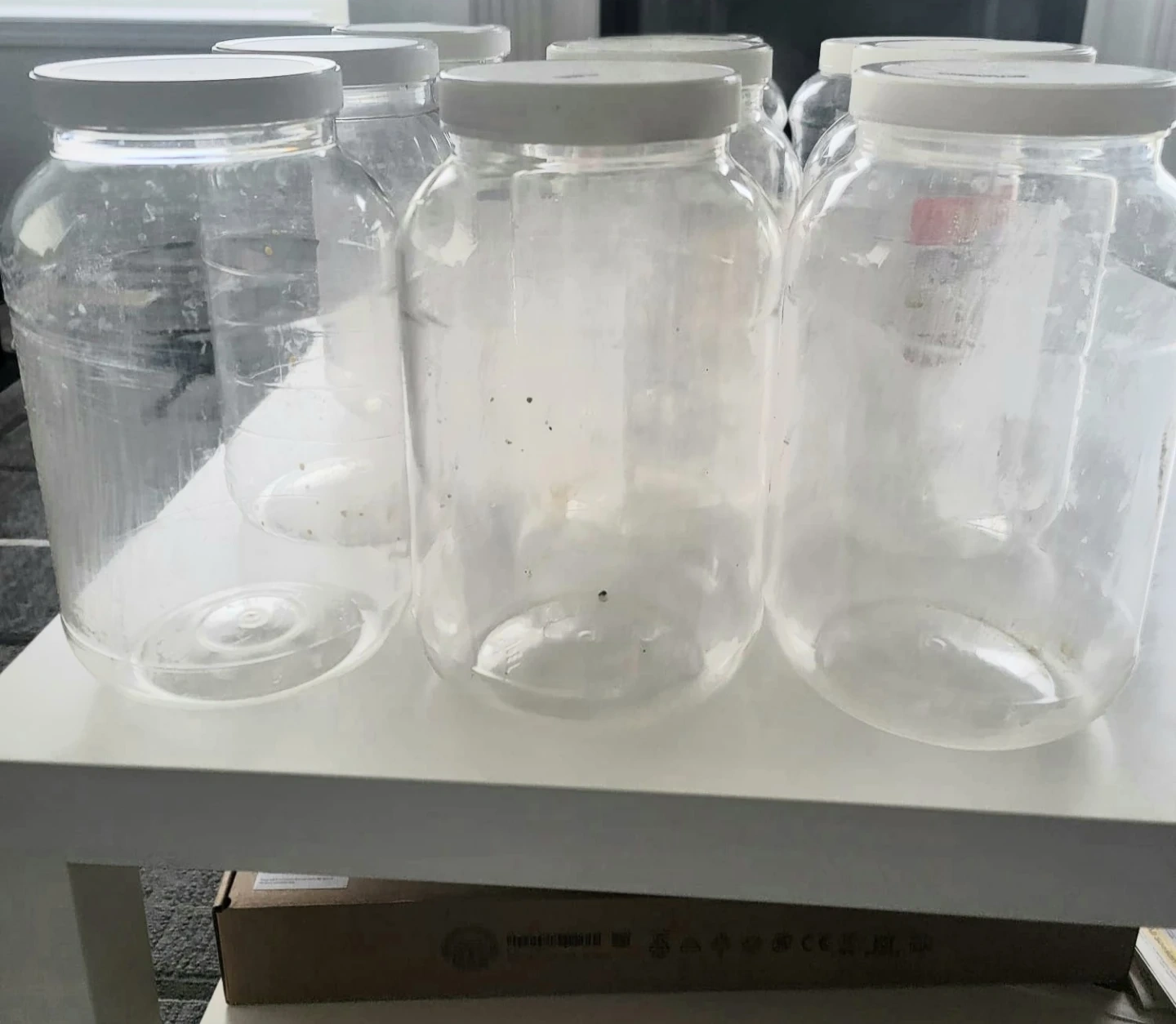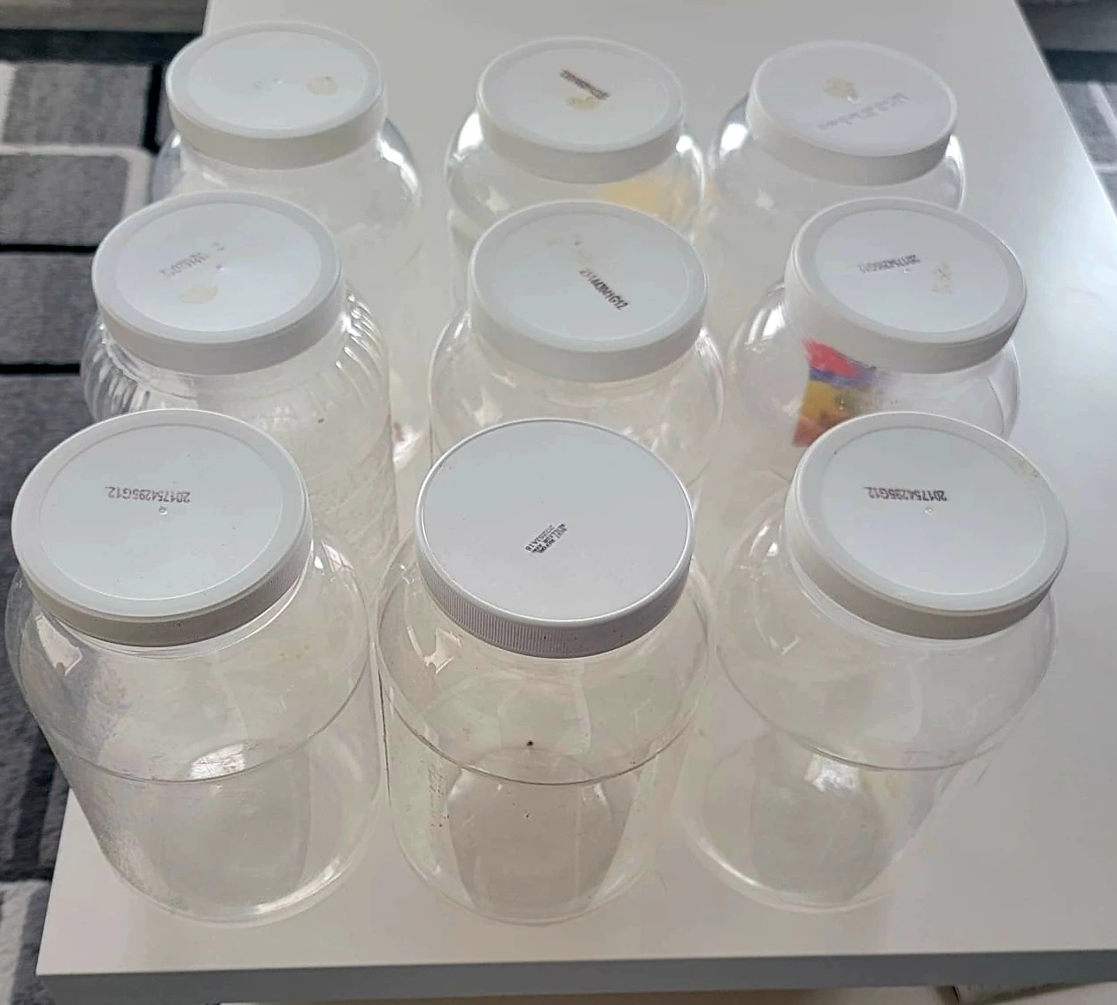 9 x Clear Plastic Storage Jars with White Lids