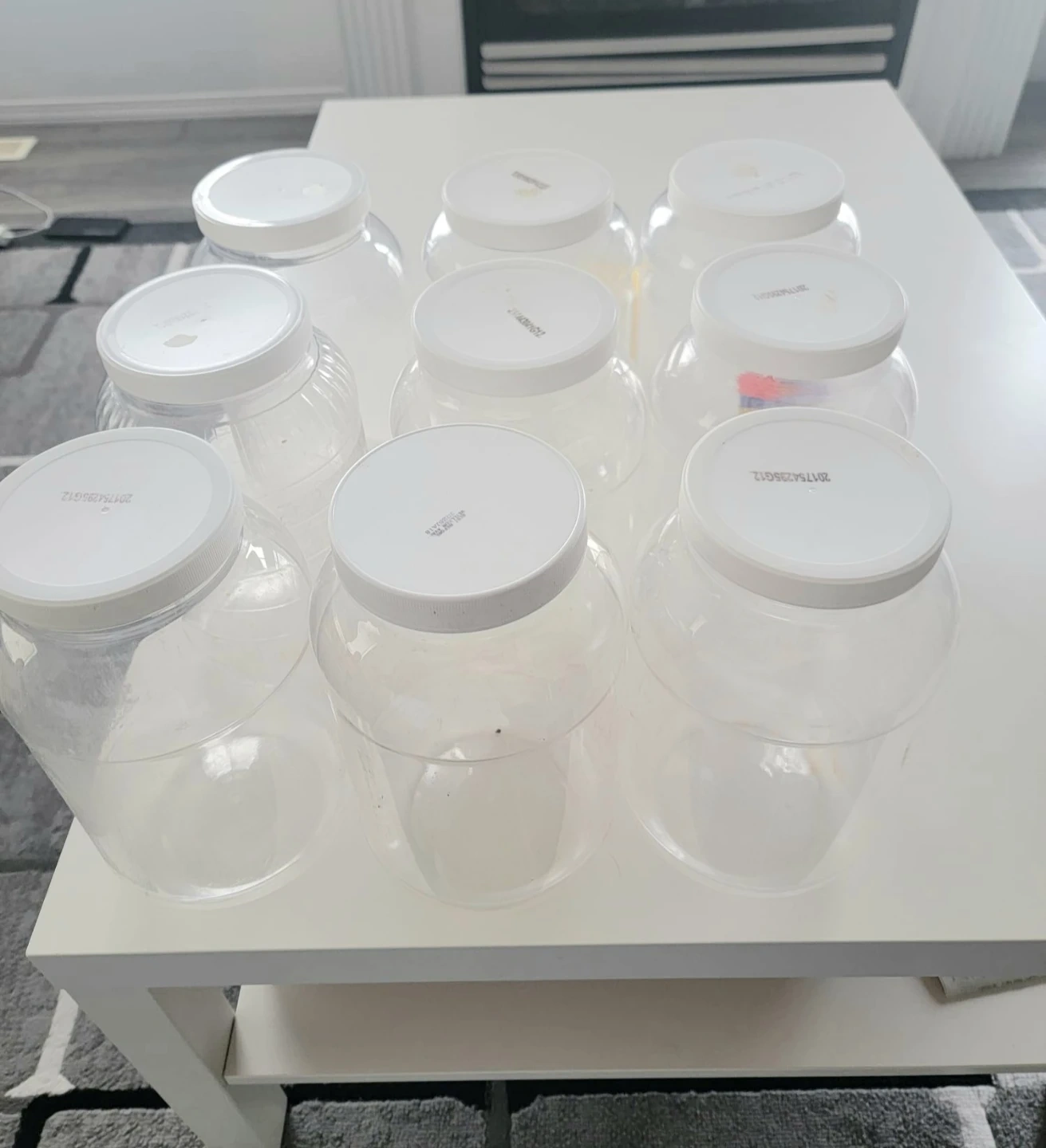 9 x Clear Plastic Storage Jars with White Lids
