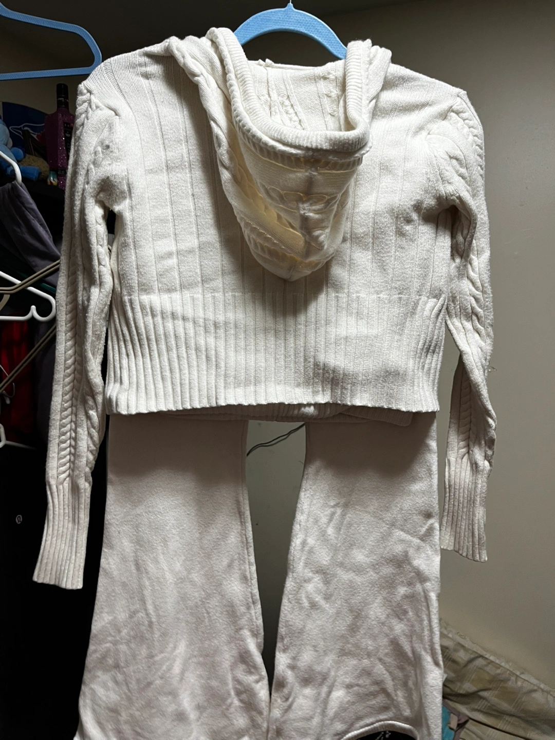 Cream-coloured knit hoodie and pants set. Long sleeves, cropped hoodie, and flared pants. Zipper closure. Size XL.