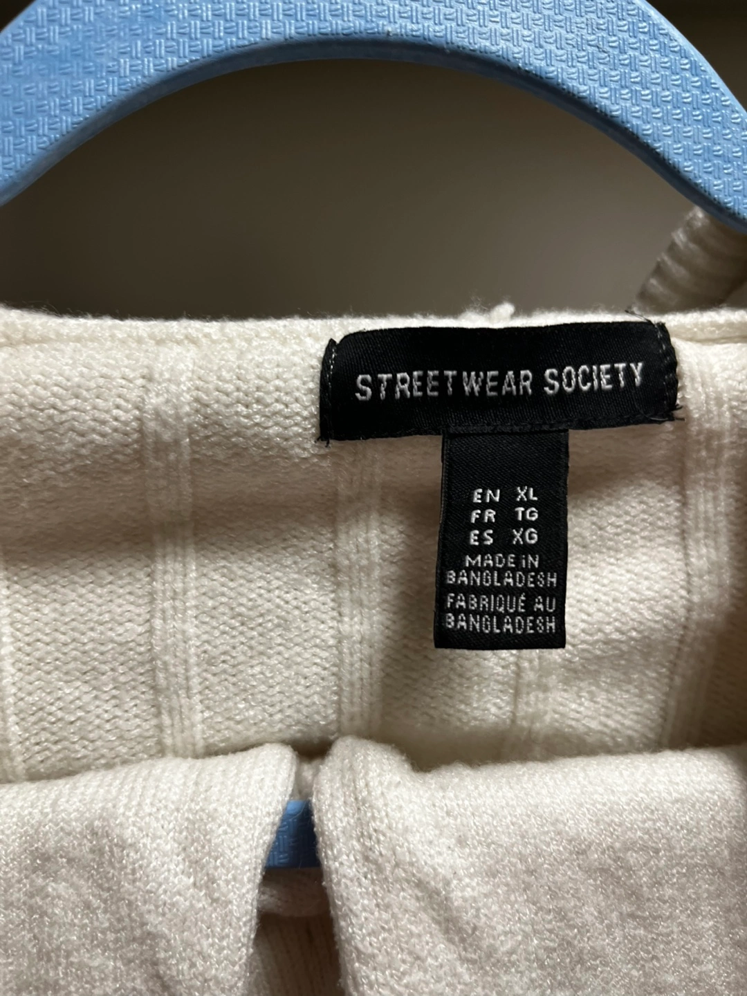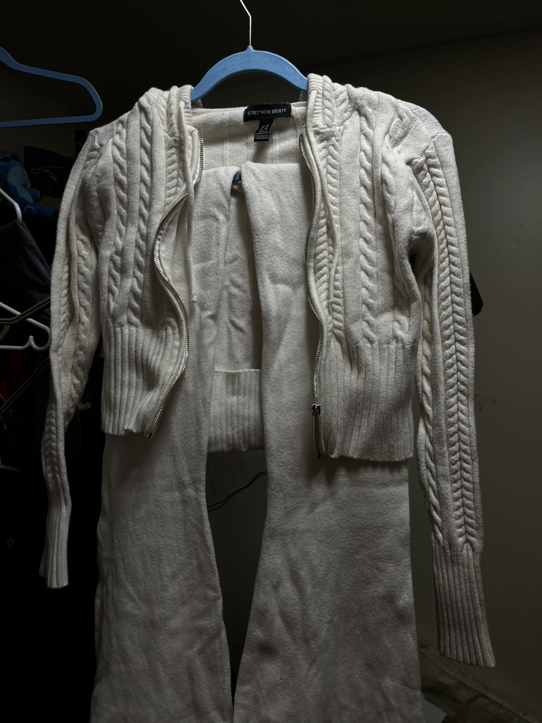 Cream-coloured knit hoodie and pants set. Long sleeves, cropped hoodie, and flared pants. Zipper closure. Size XL.