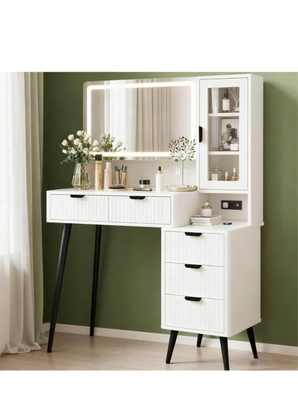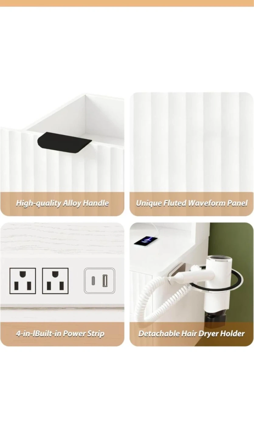 This white vanity desk features a lighted mirror with adjustable brightness and color temperature. It includes a fluted waveform panel design, high-quality alloy handles, a 4-in-1 built-in power strip, and a detachable hair dryer holder. Multiple drawers and shelves offer ample storage space. Overall dimensions are 53.5" H x 40" W x 17.5" D. Perfect for organizing your beauty essentials!