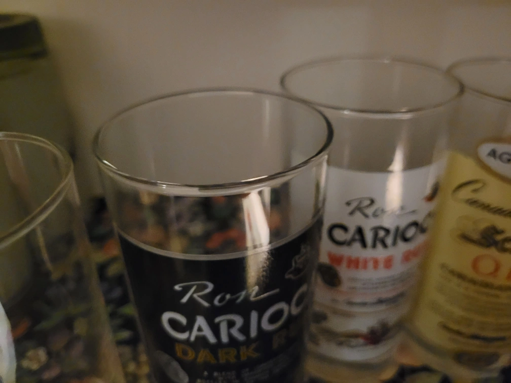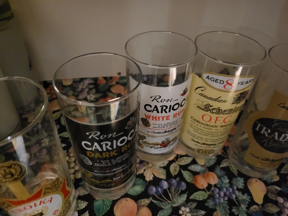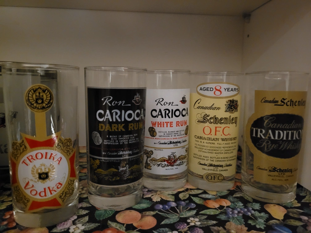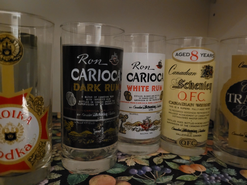 Set of 5 vintage liquor glasses. Ron Carioca Dark Rum, Ron Carioca White Rum, Canadian Schenley O.F.C. Aged 8 Years, Canadian Schenley Traditional Rye Whiskey.