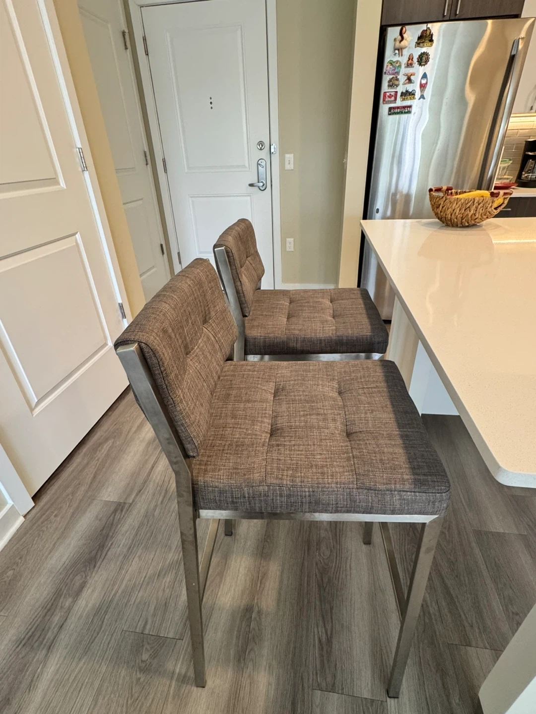 Two upholstered bar stools with a tufted design. They feature a textured gray fabric and a brushed metal frame. These stools offer a comfortable seating option for your kitchen island or bar area.