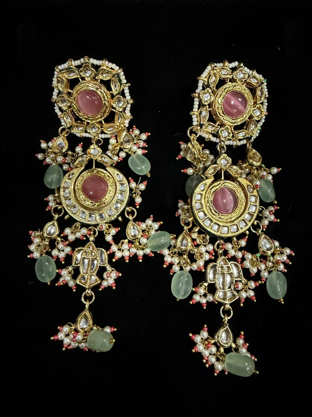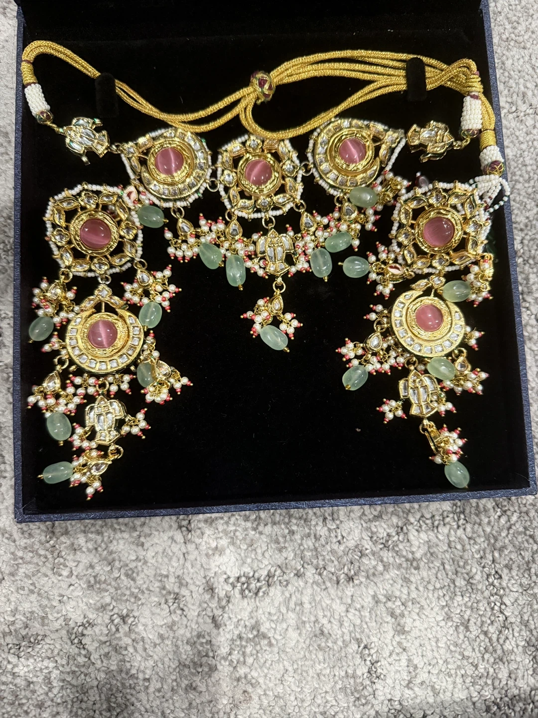 This is a stunning choker necklace set featuring intricate gold-tone metalwork. It's adorned with beautiful pink and green stones, along with pearl accents. The set also includes matching dangling earrings. It comes in a dark blue velvet-lined box.