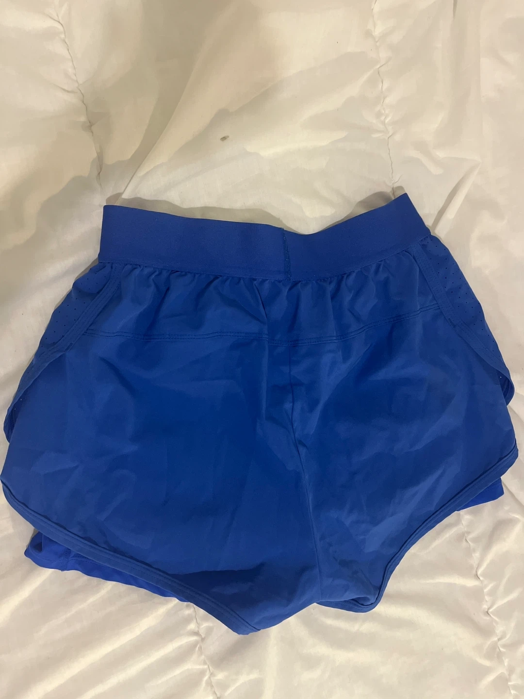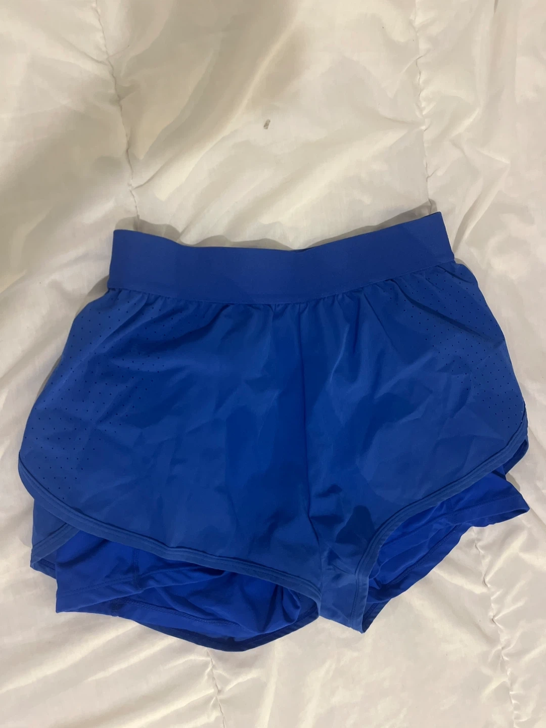 Royal blue athletic shorts with a comfortable waistband and built-in briefs with a pocket. These shorts feature side perforations for breathability. They're perfect for running or workouts!