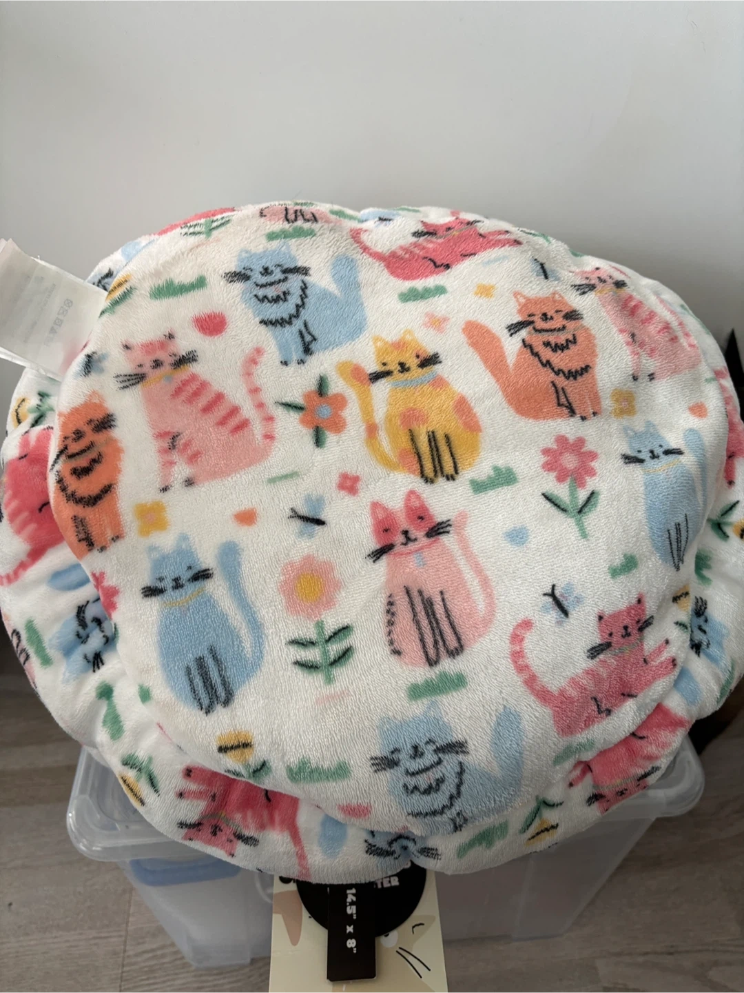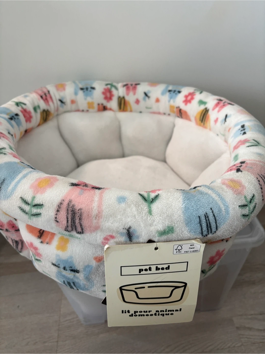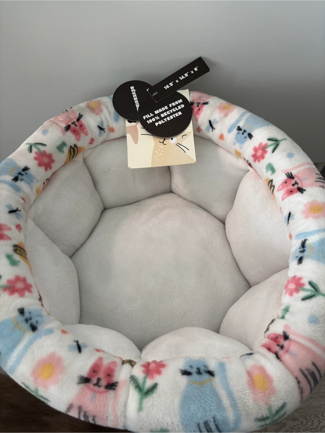 Cozy pet bed with a cute cat and flower pattern. Fill is made from 100% recycled polyester. Dimensions are 16.5" x 14.5" x 5".