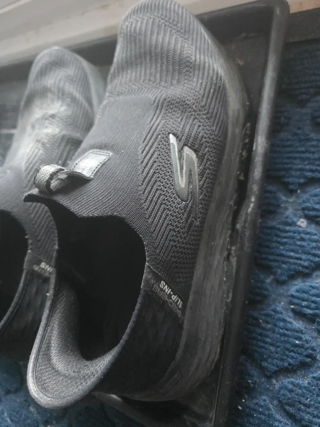 These black Skechers Slip-Ins are a men's size 11. They feature a textile and man-made upper. Slip-on design for easy wear!