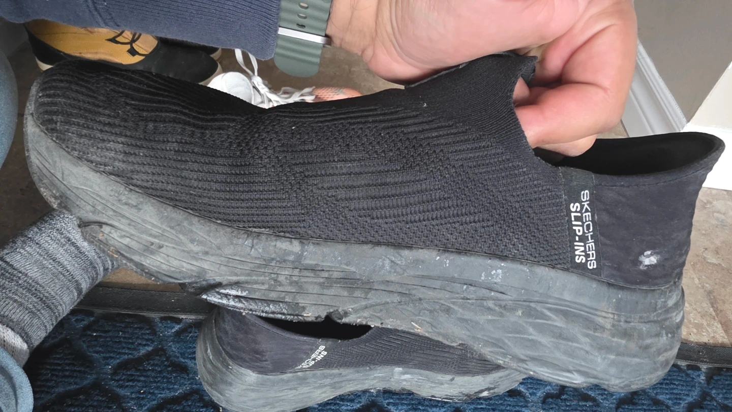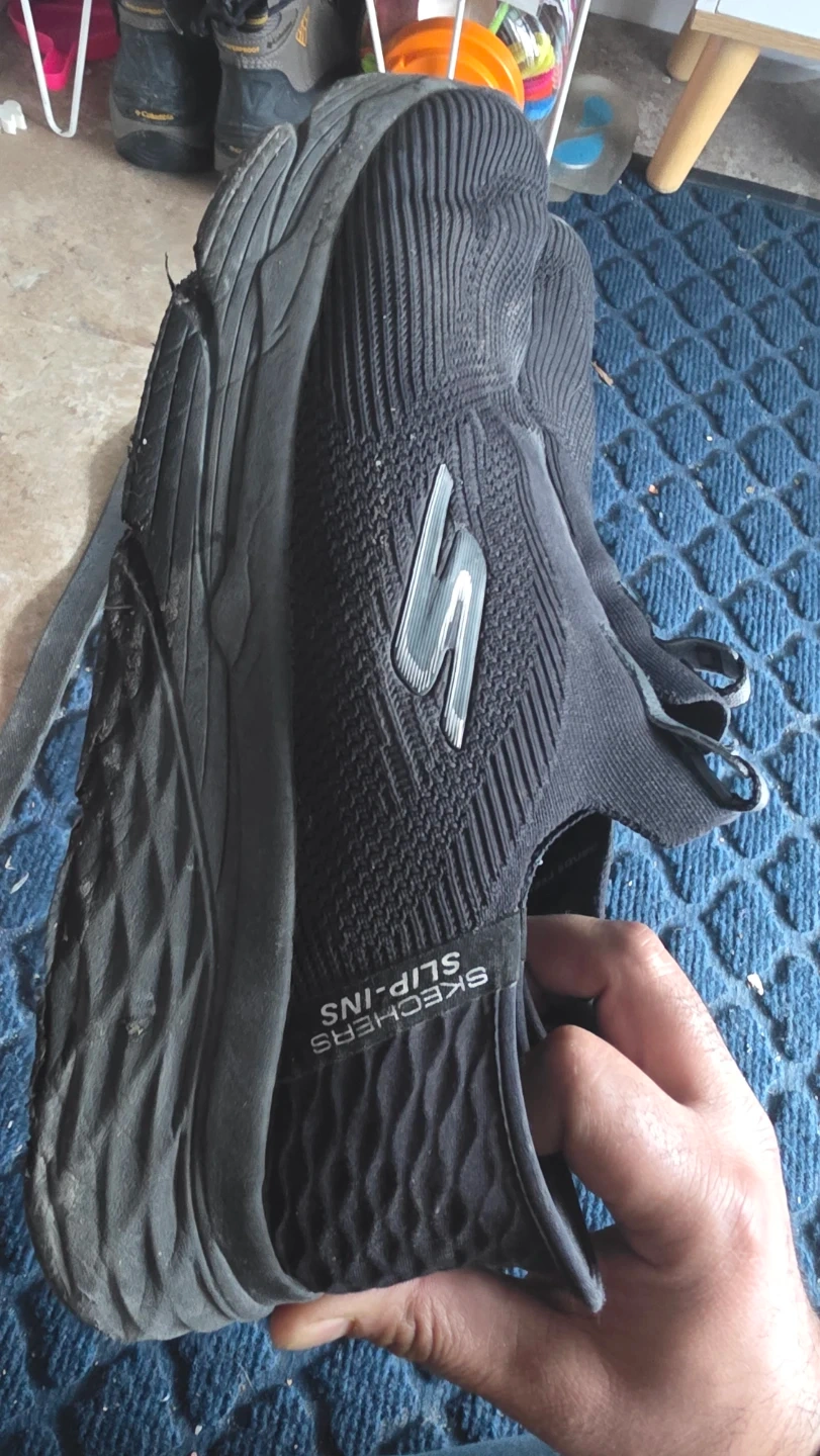 These black Skechers Slip-Ins are a men's size 11. They feature a textile and man-made upper. Slip-on design for easy wear!