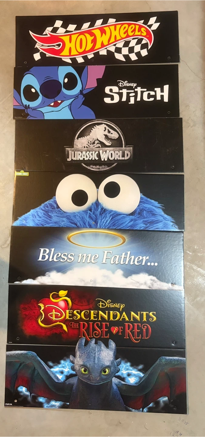 A collection of decorative signs featuring various pop culture characters and themes. Designs include Marvel's Spiderman, Disney's Stitch, Jurassic World, Super Mario, Hot Wheels, and more. These signs are great for adding a personal touch to a room or for any fan's collection.