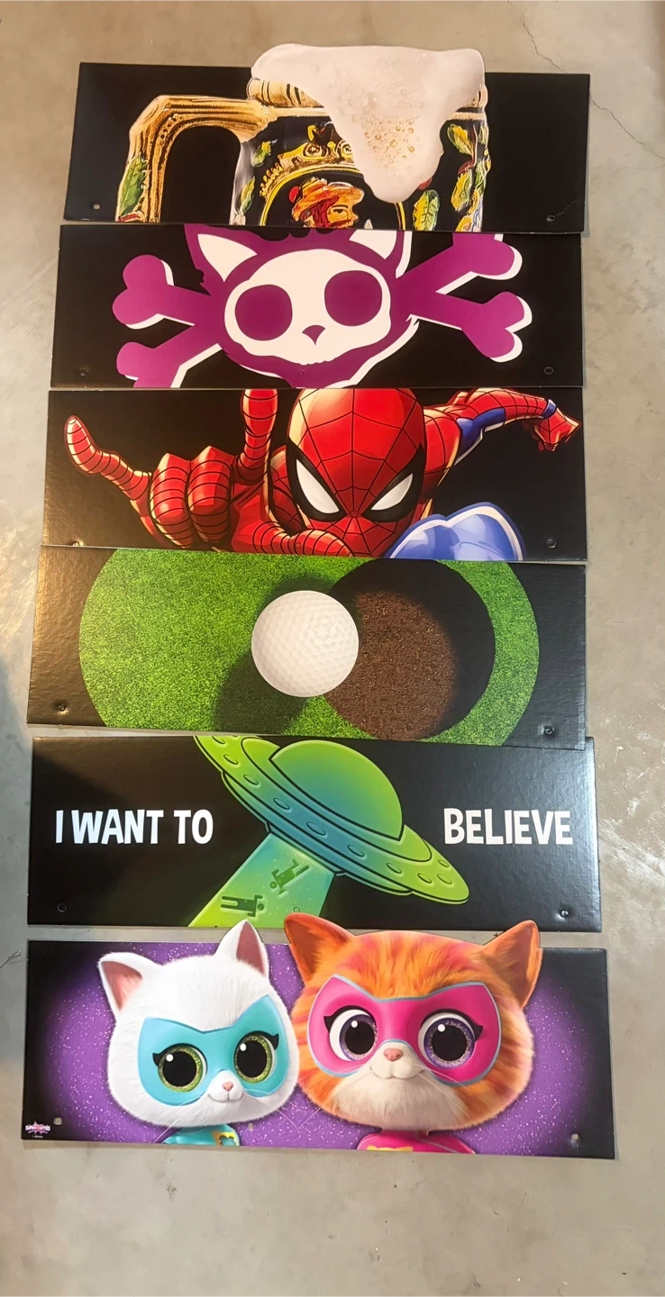 A collection of decorative signs featuring various pop culture characters and themes. Designs include Marvel's Spiderman, Disney's Stitch, Jurassic World, Super Mario, Hot Wheels, and more. These signs are great for adding a personal touch to a room or for any fan's collection.