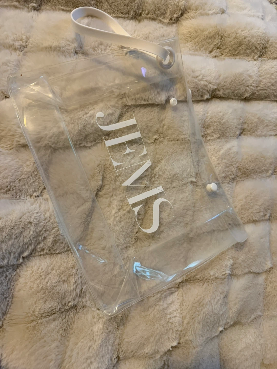 Clear vinyl travel bag with a white snap closure and a top handle. It's perfect for carrying toiletries or makeup on the go. Dimensions are approximately 10 inches wide by 7 inches tall.
