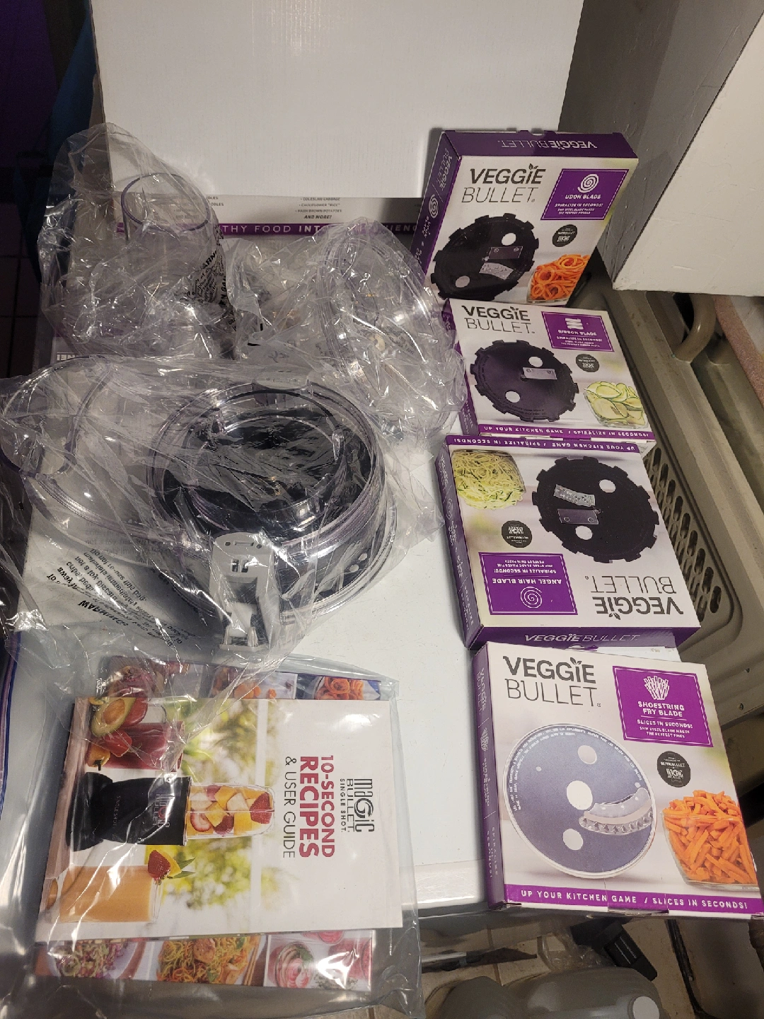 Selling a Veggie Bullet 12 piece set! It includes a high-torque power base, outer pusher, inner pusher, recipe book, shooter lid, shooter, slicer/shredder blade, spiralizer lid, spiralizer basket, spiralizer base, and spiralizer blade