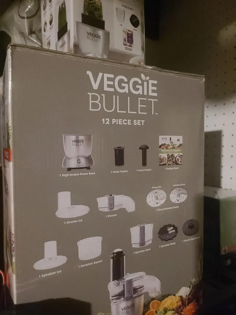 Selling a Veggie Bullet 12 piece set! It includes a high-torque power base, outer pusher, inner pusher, recipe book, shooter lid, shooter, slicer/shredder blade, spiralizer lid, spiralizer basket, spiralizer base, and spiralizer blade