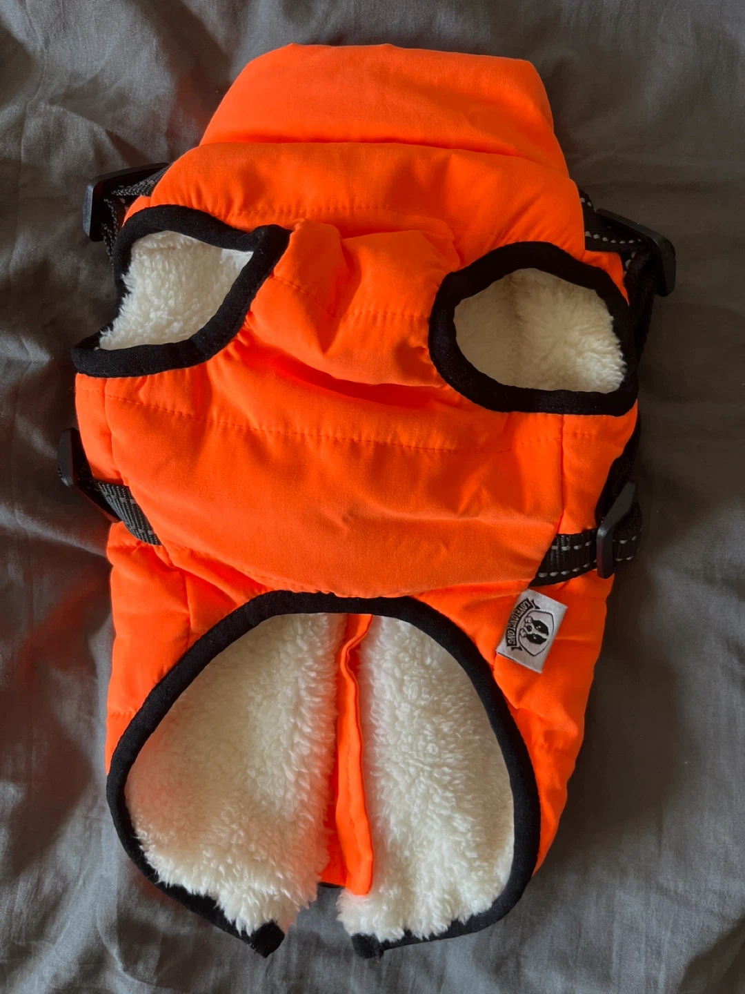This XS- bright orange padded dog vest is lined with soft white fleece for warmth. It features adjustable straps and a zipper closure for a snug fit. Keep your furry friend cozy and visible!