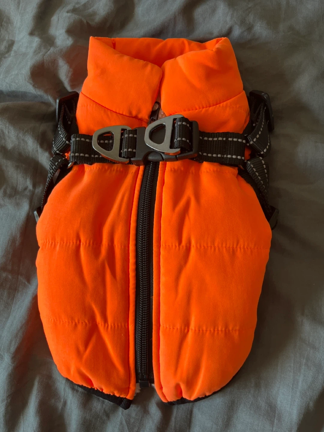 This XS- bright orange padded dog vest is lined with soft white fleece for warmth. It features adjustable straps and a zipper closure for a snug fit. Keep your furry friend cozy and visible!