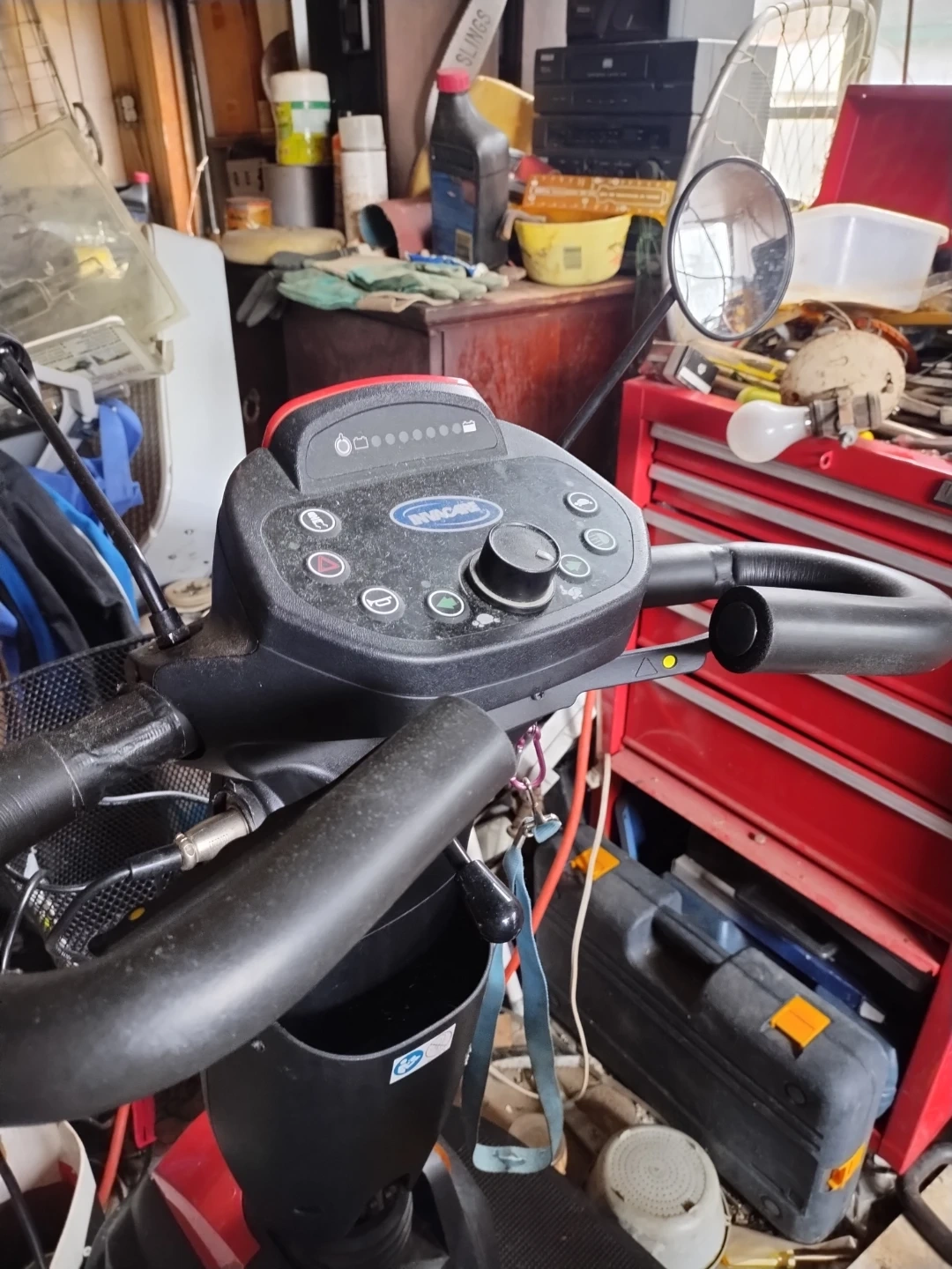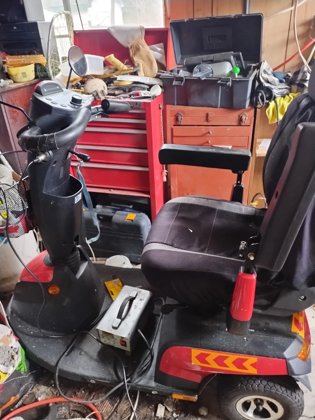 Invacare mobility scooter in red and black. This scooter features a comfortable seat with armrests and a front basket. It includes a charger.