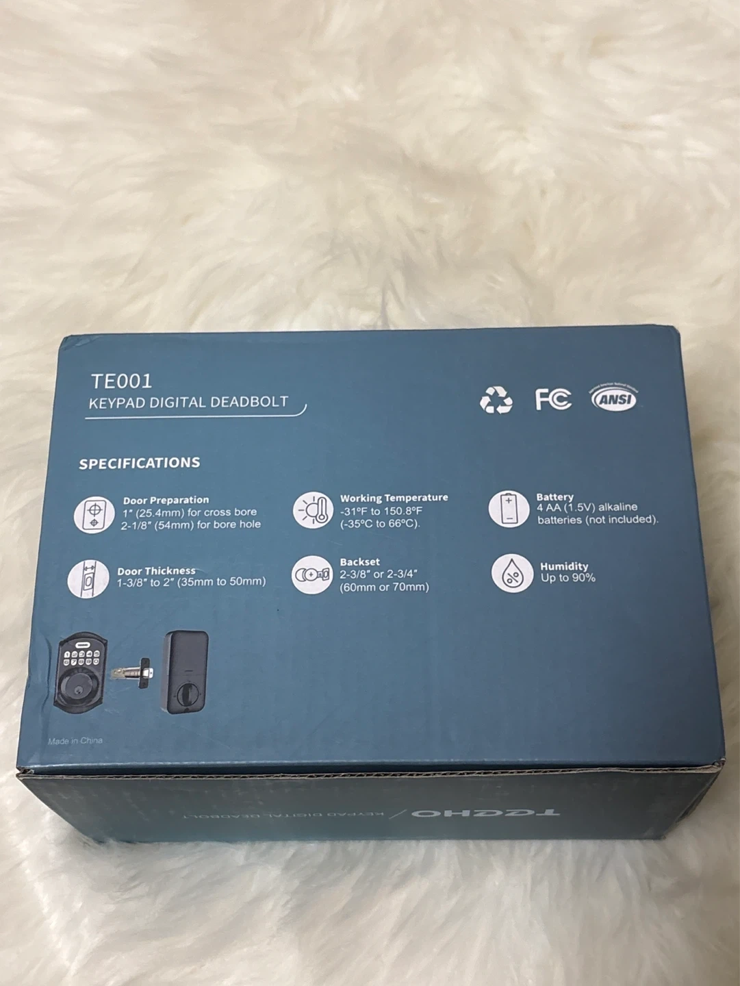 This is a TE001 keypad digital deadbolt lock. It supports door preparation for 2-1/8" or 2" cross bore. Backset is 2-3/8" or 2-3/4". It operates in a working temperature range of -4°F to 150.8°F and humidity up to 90%. Batteries not included.