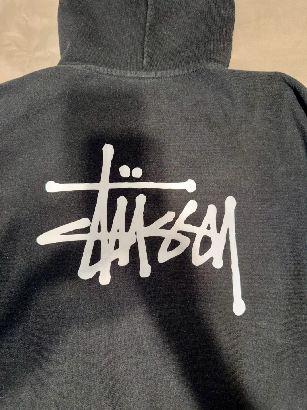 Selling a Stussy black hoodie in size medium. It's made of 70% cotton and 30% polyester. The hoodie has the classic Stussy logo on the front and back. It's in good condition and ready for a new owner! For pickup and cash only..