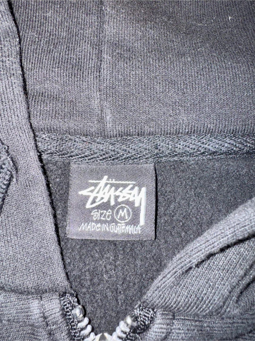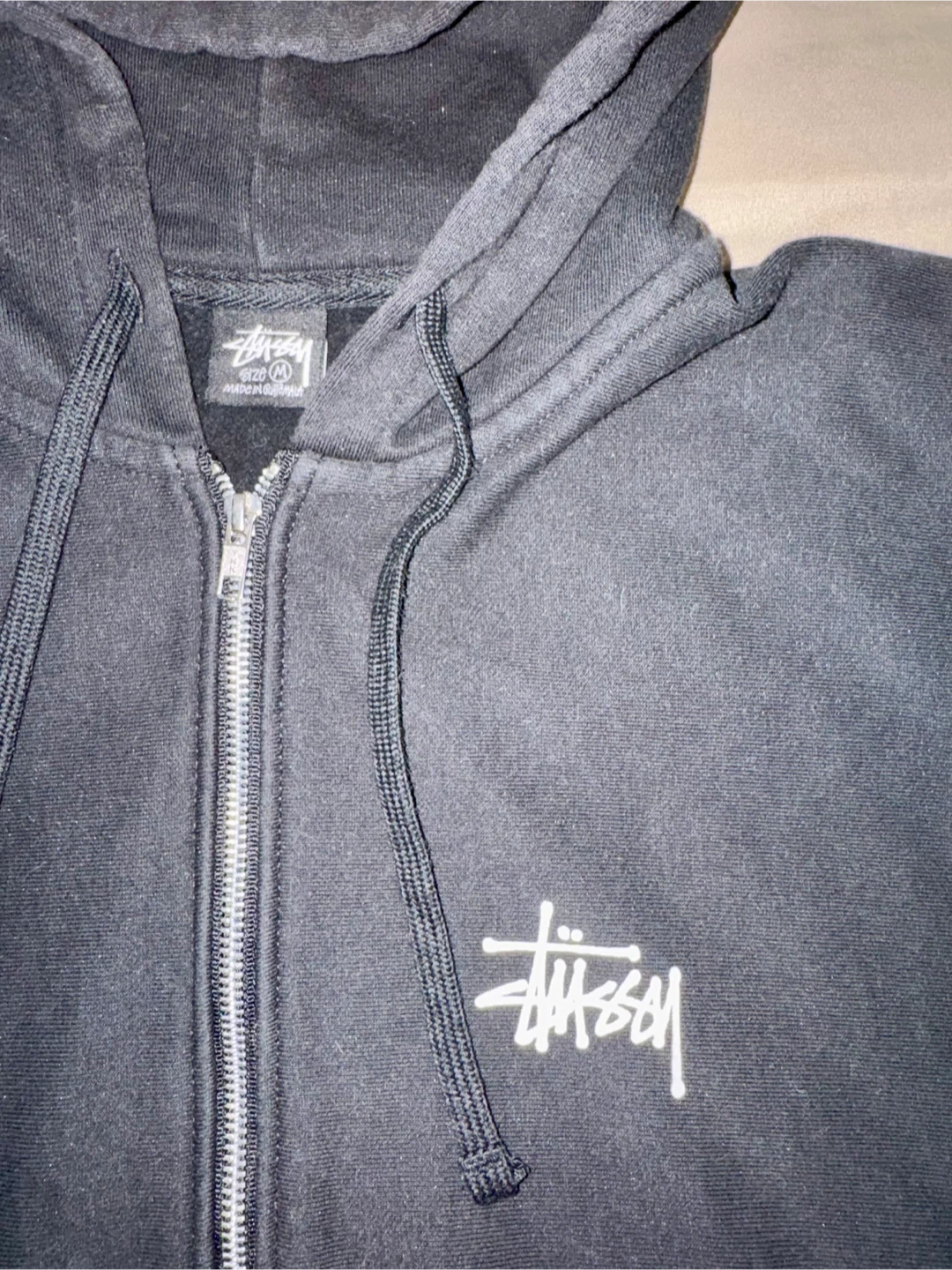 Selling a Stussy black hoodie in size medium. It's made of 70% cotton and 30% polyester. The hoodie has the classic Stussy logo on the front and back. It's in good condition and ready for a new owner! For pickup and cash only..